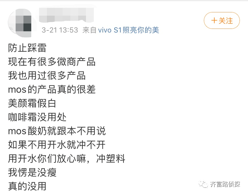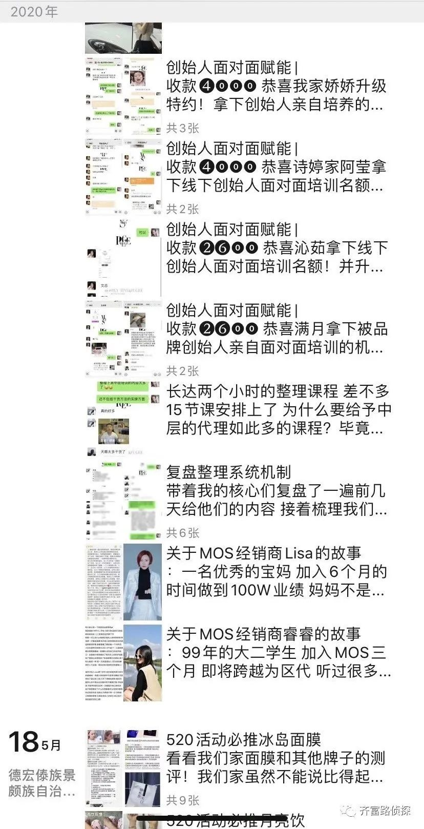 【直报网北京6月18日讯】(齐富路侦探)每当夏日来临,减肥产品就异常火爆。去年,有一款宣称明星们都在用的减肥糖果火遍小红书、朋友圈等社交应用。这款减肥糖果是微商品牌Mostly TINY(以下简称MOS)推出的,减肥糖的爆红也让MOS微商扩大了品牌的知名度。 据了解,MOS是厦门美莎贸易有限公司旗下的化妆品品牌。美莎贸易成立于2015年4月21日,主要经营化妆品及卫生用品批发、食品批发等业务。除了MOS减肥糖,还有MOS奶茶、MOS酸奶、MOS咖啡按摩膏等瘦身产品。 糖果、饮料宣称能减肥,涉嫌虚假宣传 乍一听,又是奶茶又是咖啡的,怎么还能减肥?结果,侦探发现都是些智商税,MOS宣称这些产品加入了各种酶等等让人“高深”的东西因而能瘦身,实际上不仅是伪科学,还有可能伤身。 侦探查询了这些宣称能减肥的产品,无一例外都没有正规的保健品批准文号,要么是固体饮料、要么是糖果,都是些普通食品。而MOS的代理却告诉客户,吃了这些减肥产品再辅以运动和其他节食行为,就能够在短时间内快速瘦身。 普通食品宣称能减肥等作用不仅违反了《食品广告发布暂行规定》,涉嫌虚假宣传,而且如果消费者瘦下来了也是由于运动或节食等行为造成的,并不是因为MOS产品,且不健康的饮食习惯会对身体造成伤害。 在微博上,侦探也发现许多被坑过的消费者吐槽MOS的产品。 一位前MOS代理告诉侦探,“MOS会教我们售后话术,如果客户吃了没作用,就要告诉客户是因为她自己的原因,而不是产品的原因。“ 六级分销模式涉嫌传销 那么究竟是谁在买MOS的产品呢?带着疑问,侦探添加了一位MOS代理。 打开代理的朋友圈,大多是成功吸纳新代理加入的成果分享,只有少部分是针对产品的介绍。在与代理的交流中,代理也只是简单介绍了产品后,便向侦探介绍起了MOS的代理模式。 根据代理介绍,模式代理分为VIP、特约、区代、市代、省代、官方六个级别,首次拿货价格分别为1400元、6000元、5万元、18万元、50万元和160万元。代理称,进货1400元,纯利润大概500~600元左右,进货6000元纯利润大概3000~4000元左右。 看了代理朋友圈内“宝妈半年月入百万”“99年大学生成功升级”,再加上代理天花乱坠的描述,对于一些涉世未深的大学生和经验不足的宝妈群体来说,MOS项目投入少、利润高,赚钱似乎十分容易,不仅能赚点零花钱,说不定还能成为一份大事业,很难不动心加入MOS。 转账图造假、代理费不退,不少宝妈大学生上当 然而事实真的如此吗?侦探进行了深入的调查。 侦探添加了一位自称曾是MOS代理的大学生小法(化名),她爆料称,MOS代理朋友圈的出单图、转账图都是假的,是用软件做出来的,实际上并没有这么多的出单量和新加入的代理。 侦探也在社交网站上发现有人爆料称,“室友假期瞒着家人拿了1400去做这个,原本说四个月还是几个月卖不出去一单就给你退钱,结果根本不给退,她还被她上级忽悠着买了她家一个减肥奶昔,压根没用还两三百。而且基本上没几个人买,她朋友圈发的那些交易截图都是我们宿舍几个人换着头像名字陪她演戏,做假做半年了一单没出,一段时间还会有人查你朋友圈发的东西合不合格。 在一份宣传图片中,Mos自称品牌引流绝对是微商界的NO.1,加入即会送客源、送粉丝、送精准流量。 但知情人告诉侦探,所谓的引流,就是叫你去各种明星超话里评论,说什么包邮送口红啊、送水杯啊各种!根本引流不到真正购买产品的客户,并且还赔了钱。 一位曾做过MOS微商的代理称,“我是19年9月26号交的预订代理,到19年10月26号补齐1400成为正式代理,在补款时候我四处借钱才补齐的。从补齐开始我每天听培训完成任务,但就是出不了单引流不来人,而且我又不可能去卖给亲戚朋友。 我就去问上级我为什么没有引流来人,但给我永远的答复都是我自己的原因才没有人来买我的产品,我现在高一,没有时间和精力去做这些事情,而且自己上级有时根本就不理我,甚至我给她发信息一个星期也可以不回我,只有我主动去找她联系她才会回复!“ 小法还告诉侦探,当她向上级提及赠送客源时,上级代理告诉她只有升级更高级别的代理,才会赠送客源,而当小法升级后,并没有获得所谓的赠送客源。 而当代理想要退出时,MOS却不肯退款。 在一张MOS退款要求的图片中显示,两个月不出单,第一次门槛费全部退款。但下方也提出了4点要求,包括60天每天更新8条朋友圈;朋友圈70%内容为原创;60天加满2000人;找上级一对一教导超过20次。下面一排小字还显示,若卖出一单同样不退款。 如此的要求显然十分苛刻,代理小法直言,若是能达到上述要求,还愁赚不到钱吗?说白了MOS就是不想退钱。 在几经折腾后,侦探发现一位成功退款的MOS代理,她称,MOS让她签署了协议书后才肯退钱给她。 而这份协议书,MOS规定了其不得从事与甲方产品具有相同或类似产品的相关的业务,且没有对期限做出规定。这也就是说,该代理今后都不能够再从事与化妆品、减肥产品等任何与MOS产品类似的产品的业务,否则就违法了协议,面临罚款。 如此这般不退款、退款难的投诉在知乎、贴吧等社交平台上比比皆是。大多以宝妈、大学生为主,MOS利用这些人信息不对称,又想赚点小钱作为零花钱或是信心满满的开启第一份创业的心情,一步步进行利诱,最终致使他们上当受骗。