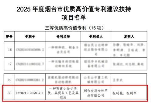 【直报网北京9月29日讯】(金天国际)近日,金天国际申报的《一种雪莲小分子多肽、其提取工艺及其应用》专利,凭借高创新性、稳定权利状态及市场竞争力,获得2025年度烟台市高价值专利建议扶持项目“三等优质高价值专利”殊荣。 高价值专利作为创新发展的“金色种子”,是企业发展的生命线和护城河,是企业核心竞争力的重要体现,此次获奖标志着我司在关键技术领域的研发实力获权威认可。