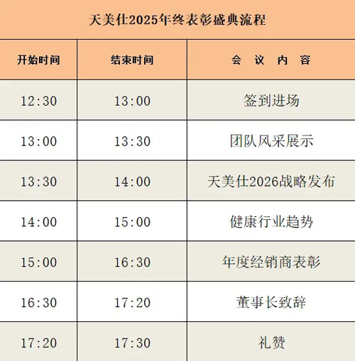 天美仕2025年终盛典 天赋焕新 美启新程 【直报网北京12月18日讯】(天美仕)天赋焕新,美启新程!天美仕2025年度盛典邀您共赴荣耀之约!荣耀时刻,星光已就位。这不仅是荣耀的加冕礼,更是未来的开幕式。 为确保大家拥有顺畅舒心的参会体验,还请留意这些小细节:提前规划行程、准时到场签到,参会时保持手机静音、遵守会场秩序,同时保管好个人随身物品,让我们共赴这场年度之约。 相约厦门 不见不散 ![]() 活动时间:12月22日 12:00—17:30 活动地点:厦门翔安国博中心五洲厅 有序进场 文明参会 ![]() 【温馨提醒】 1.活动期间人数较多,请各团队有序进场。 2.附大巴车进场动线说明图: 南广场下客完成后,大巴车前往大巴停车场。 3.活动结束后,请大家有序离场,遵循现场安保引导及团队引导,有序上车。 展望未来,共绘新篇 ![]() 活动签到时间: 12月22日 12:00-12:30 活动入场时间:12月22日 12:30-13:00 请大家提前做好时间规划安排,有序进场。 进场后,可凭借门票兑换券前往【签到区】领取本次活动物资。 【重要提醒!!!】 1.绿宝石及以上经销商可前往专属VIP通道报到并领取物资及对应聘阶的徽章。 2.绿宝石及以上经销商进入内场后,请前往面对舞台右侧前排留座区就坐(对应留座贴)。 3.请所有登台参与表彰的家人,严格遵循大会筹委会之规定,着正装或礼服出席本次盛典,请提前做好准备(无正装者取消上台颁奖资格)。 ![]() 天赋焕新 美启新程 ![]() 【温馨提醒】 未来几日冷空气频繁到访,厦门气温整体偏低。 1. 昼夜温差显著,出行请及时添衣,注意保暖防寒。 2. 会场人员密集,建议全程规范佩戴口罩,做好个人健康防护。 3. 外出期间,请妥善保管身份证件及随身财物。 4. 场馆配备安保查验设施,严禁携带各类危险物品入场。 一场思想碰撞的饕餮盛宴 一次零距离与大咖交流的机会 12月22日,齐聚“鹭岛”厦门