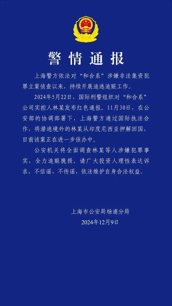 【直报网北京1月7日讯】(金融法眼)近日,上海市第二中级人民法院披露“和合系”非法集资案件最新进展,该案于11月19日至20日一审公开开庭审理,将择期宣判。 据公诉机关指控,林强等人在实际经营“和合系”公司期间非法发行、销售理财产品,非法集资1000余亿元,未兑付本金300余亿元。此外,公司实控人林强通过境内转账、跨境转移资产等方式洗钱共计8亿余元。 数额如此巨大的非法集资如何实现?“和合系”公司将私募理财产品拆分数期滚动发行、允许集资参与人拼单购买等方式规避人数限制,并以承诺6%至10.5%的年化收益为诱饵,冒用原备案但已清算的资管产品,在全国多个省市金融资产交易机构挂牌备案,形成了一个巨大的庞氏骗局犯罪链条。 “和合系”非法集资系列案一审开庭 投资者300余亿元本金仍未兑付 据上海市第二中级人民法院消息,2025年11月19日至20日,上海市第二中级人民法院一审公开开庭审理被告单位和合资产管理(上海)有限公司(以下简称和合资管)、上海和合企业管理有限公司、尚智逢源(北京)基金销售有限公司(统称“和合系”公司)、被告人林强、张振杰、鄂长俊、梁佳明、叶刚、王泓量、曹伟、张淳集资诈骗、非法吸收公众存款、洗钱等系列案。 ![]() 图源:“上海二中院”微信公众号(右一被告人为林强) 根据公诉机关指控,2019年1月至2023年8月,林强在实际经营被告单位“和合系”公司期间,伙同张振杰、鄂长俊、梁佳明、叶刚、王泓量、曹伟、张淳等人,明知“和合系”公司未经国家金融监管机构批准,仍以虚构的投资票据贴现等业务为幌,通过开设销售网点、召开产品推介会、口口相传等方式公开宣传,采取将私募理财产品拆分数期滚动发行、允许集资参与人拼单购买等方式规避人数限制,并以承诺6%至10.5%的年化收益为诱饵,采取冒用和合资管原在中国证券投资基金业协会备案但已清算的资管产品,以及在全国多个省市金融资产交易机构挂牌备案等方式非法发行、销售理财产品,向社会不特定公众非法募集资金共计1000余亿元,未兑付本金300余亿元,所募集资金绝大部分用于兑付本息,少部分用于公司经营、对外投资及个人挥霍。 其中,“和合系”实控人林强为掩饰、隐瞒其本人实施集资诈骗犯罪所得及其产生收益的来源和性质,指使他人通过境内转账、跨境转移资产等方式转移其控制“和合系”公司期间非法募集的资金,数额共计8亿余元。 公诉机关认为,上述三家被告单位及其直接负责的主管人员林强、张振杰、鄂长俊、梁佳明、曹伟、张淳,伙同叶刚,以非法占有为目的,使用诈骗方法非法集资,数额巨大,均构成集资诈骗罪;被告人王泓量作为公司直接责任人员,非法吸收公众存款,数额特别巨大,构成非法吸收公众存款罪。此外,林强构成洗钱罪,叶刚构成非国家工作人员受贿罪、诈骗罪。 上海市第二中级人民法院将择期对该案进行宣判。 失联一年后落网 林强实控公司宣布严重资不抵债 “和合系”的暴雷可追溯至2023年。2023年8月,公司实控人林强被曝失联。同月,和合资管发布公告称,因林强无法取得联系,为保证公司正常运转,经公司高层商讨决定,成立临时领导小组。 和合资管为和合期货有限公司(以下简称和合期货)的全资子公司,注册资本1.6亿元。和合期货成立于1993年,注册资本金3.9亿元,林强为其幕后实控人。 林强被曝失联前曾“光环加身”。公开资料显示,林强毕业于上海交通大学国际经济与贸易专业,获上海交通大学EMBA硕士学位、北京大学DBA博士学位。他拥有近二十年的金融行业从业经验,先后任职于国泰人寿、国金证券等机构,多次获得业内荣誉。 2016年,林强辞职创立上海和合首创投资管理有限公司(以下简称和合首创),担任法定代表人和董事长。2021年,林强收购和合期货,“和合系”业务版图涵盖股权投资、证券投资、票据投资、房地产等多个领域。 事发后,和合首创随即开启兑付工作。自2023年10月起,和合首创发布多条公告通知投资者兑付情况。根据公告内容,截止2023年10月31日,和合首创尚未兑付的金额高达52.56亿元。2024年1月3日,和合首创宣布完成超5亿元的首批兑付,偿付客户数量六千人。 然而,兑付工作很快就戛然而止。2024年4月9日,和合首创公告宣布停止兑付:“自公司及相关企业产品出现到期无法兑付的情况以来,虽采取一系列措施进行补救,但成效不及预期。目前,公司及相关企业已严重资不抵债,存在重大持续经营风险已无力兑付,自即日起暂停兑付工作。” 令人唏嘘的是,林强曾公开表述过金融业最重要的就是敬畏金融市场,保护投资者利益,“没必要去越线”。他曾宣称:“金融服务机构要久久为功,为各方投资者营造出一个持续稳定的投资环境,让投资者可以安心投资、放心投资。”然而,林强实际上钩织庞氏骗局、搅乱市场秩序、巨额非法集资,再多“甜蜜”的谎言也难逃法律的制裁。 2024年4月10日,上海市公安局杨浦分局对“和合系”公司涉嫌非法集资犯罪启动了立案侦查。2024年12月9日,上海市公安局杨浦分局发布警情通报称,上海警方依法对“和合系”涉嫌非法集资犯罪立案侦查以来,持续开展追逃追赃工作。 通报指出,2024年5月22日,国际刑警组织对“和合系”公司实控人林某发布红色通报。11月30日,在公安部的协调部署下,上海警方通过国际执法合作,将潜逃境外的林某(编者注:林