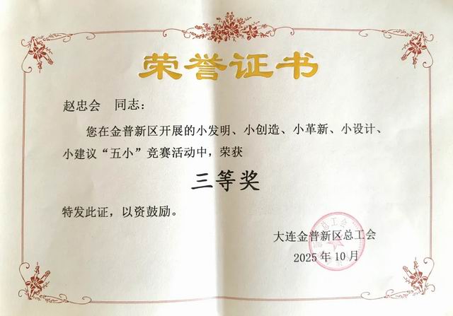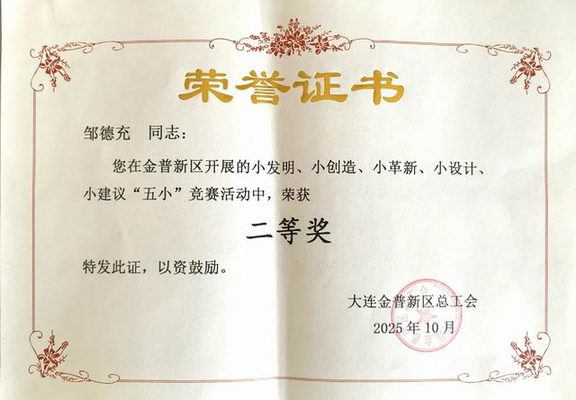 【直报网北京10月23日讯】(双迪)近日,从金普新区总工会传来喜讯,大连双迪科技股份有限公司(以下简称为:双迪股份)在2025年度“五小”创新成果评选活动中表现卓越,申报的四项成果全部获奖。其中设备管理部邹德充获二等奖,生产部赵忠会获三等奖,设备管理部姜龙章、研发二部车虹昌获优秀奖。本年度共吸引了来自50家基层单位的564项成果参与“五小”角逐,能够脱颖而出充分彰显了双迪公司在群众性技术创新领域的雄厚实力。 ![]() 设备管理部邹德充荣获“五小”竞赛二等奖 ![]() 生产部赵忠会荣获“五小”竞赛三等奖 ![]() 设备管理部姜龙章荣获“五小”竞赛优秀奖 ![]() 研发二部车虹昌荣获“五小”竞赛优秀奖 所谓“五小”,即指围绕企业生产经营中的实际问题开展的“小发明、小创造、小革新、小设计、小建议” 活动。这些看似微小的创新举措,却能产生远超预期的实际效益,是激发企业员工创新潜能、推动技术进步和降本增效的重要平台。本次双迪股份获奖的成果涵盖了生产经营过程中多个关键领域,申报课题均来自一线员工在日常工作中的智慧结晶与实践探索。来自生产一线的智慧火花,正汇聚成推动企业高质量发展的璀璨星河。 此次多项“五小”成果的获奖,是双迪股份长期坚持创新驱动发展战略的缩影。这些源自实践、用于实践的创新项目,不仅直接带来了经济效益和管理效率的提升,更在公司内部营造了“人人皆可创新、处处皆有创新”的浓厚文化氛围,为企业的高质量发展注入了源源不断的内生动力。