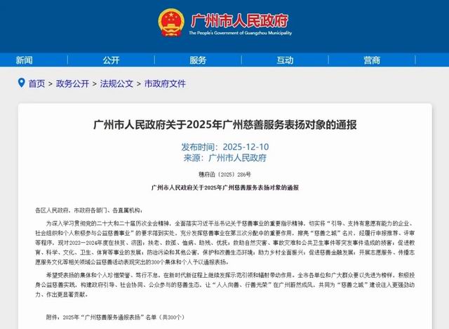 【直报网北京12月17日讯】(无限极)无限极被广州市人民政府“点赞”啦!近日,在广州市人民政府发布的《广州市人民政府关于2025年广州慈善服务表扬对象的通报》中,无限极(中国)有限公司凭借在2023—2024年度公益慈善领域的突出贡献,荣获“广州慈善服务表扬对象”称号,并在港澳台及外资企业类别中位列第五名。这一荣誉是对无限极长期以来积极履行企业社会责任、投身公益慈善事业的高度认可!