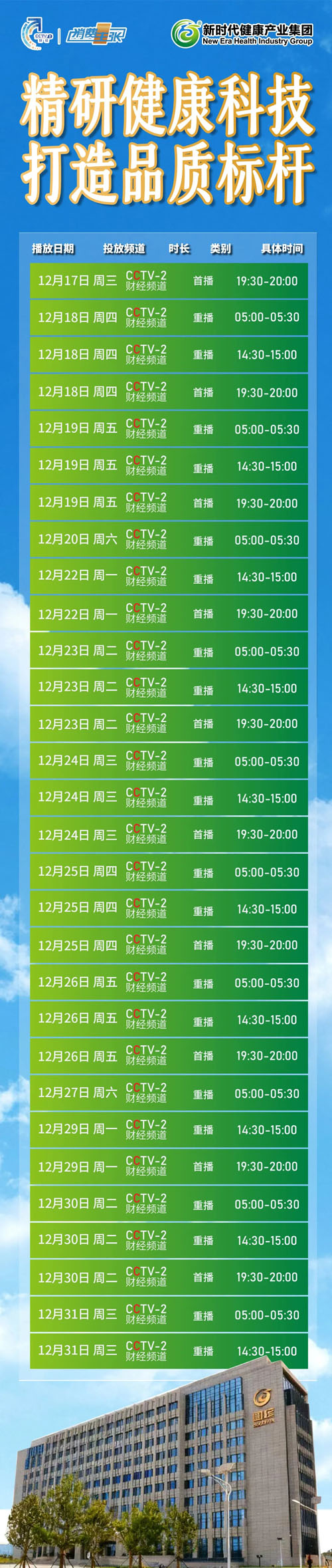 ![]() 【直报网北京12月17日讯】(新时代)深耕健康领域三十年 我们从未停歇 始终坚守 “从原料到研发,从产品到服务” 的全产业链品质把控 推动中国健康产业高质量发展 赢得国民信赖 同时 作为《健康管理保健服务规范》 国家标准起草单位之一 始终秉持标准化、专业化、规范化 的服务理念 融合科研创新与专业健康顾问团队 为每一个家庭提供可信赖的健康保障 今天,这份源自万千家庭的信任 登上了更大的舞台 公司企业形象短片 将在央视荧屏与全国观众见面! 播出频道 CCTV-2财经频道《消费主张》栏目 《消费主张栏目》播出时间 12月17日-30日(短片在栏目播放期间播出) 首播时间:周一至周五(工作日) 19:30-20:00 重播时间:首播次日 05:00-05:30、14:30-15:00