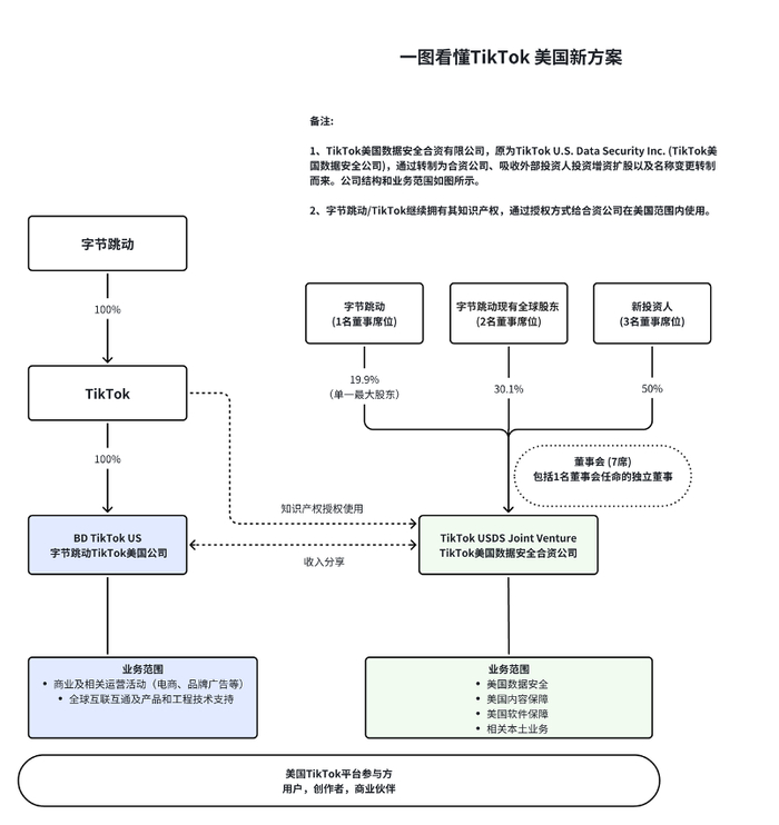 【直报网北京12月19日讯】(新快报)据外媒报道,当地时间12月18日,TikTok CEO周受资发出内部信,更新了TikTok美国业务进展。内部信称字节跳动、TikTok已与三家投资者签署协议,并将成立新的TikTok美国合资公司。新合资公司名为TikTok美国数据安全合资有限责任公司( TikTok USDS Joint Venture LLC),将负责美国的数据保护、算法安全、内容审核和软件保障。由字节跳动全资控股的、TikTok在美国的其他实体将继续负责电商、广告、市场运营等商业活动,以及TikTok产品的全球互联互通。据悉,协议相关事宜将在不晚于2026年1月22日完成。 这与国内媒体此前曝光的TikTok美国方案一致。 据此前媒体报道,TikTok未来在美国运营主要涉及两个主体。上图左侧的“字节跳动TikTok美国公司”,将负责电商、品牌广告等商业活动,以及全球互联互通等。该主体由字节跳动100%全资持有。 ![]() 上图右侧的TikTok美国数据安全合资公司,即此次内部信提到的TikTok美国数据安全合资有限责任公司。它将负责美国数据与内容安全、软件保障等,以符合美国法律要求。 内部信还提到,新合资公司将负责算法安全。据此前媒体报道,字节跳动会继续拥有TikTok算法的知识产权,授权新合资公司使用,并向后者收取授权费。 据了解,电商、广告、市场运营等商业活动是TikTok的主要收入来源,仍将由字节跳动全资控股的TikTok美国公司等实体负责。新合资公司负责的数据、内容安全等业务为非营利性质,且运营成本很高。为保障合资公司运营,上述主体间会有商业上合理的收入分享安排。 除了两家公司的业务分配,TikTok美国数据安全合资有限责任公司的董事会席位、股权架构等,也与此前披露的情况相同。 TikTok内部信显示,字节跳动、TikTok已与三家投资者签署协议,包括甲骨文公司、银湖及MGX。上述新投资者合计持有新合资公司45%的股份;字节跳动部分现有投资者及其关联方持股30.1%,字节跳动将保留19.9%的股份。据了解,字节跳动仍为新合资公司的最大单一股东。此外,新合资公司将由美国投资者持有多数股权,并由新的七人董事会管理。
