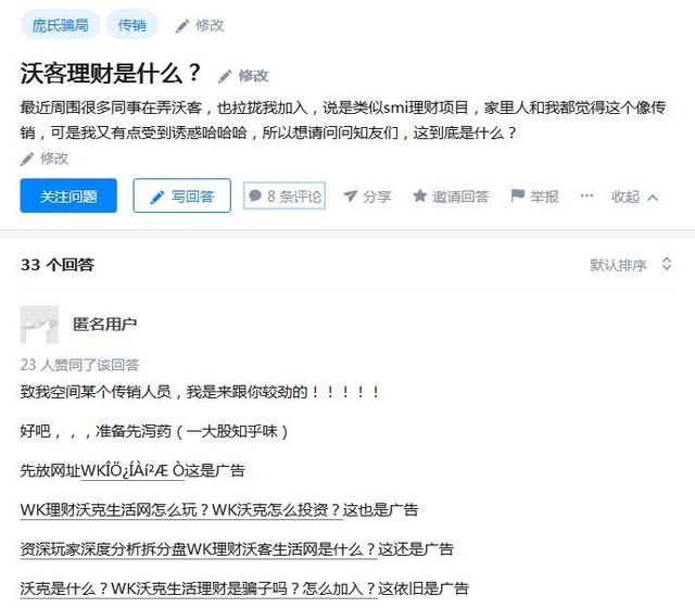 【直报网北京6月19日讯】(北京时间)近日,一个叫做“沃客”的知名理财投资平台被通报!又是一场血淋淋的传销骗局! 不太一样的是:这次的案子确实有点大:涉案金额高达50亿!35万人集体被套被骗!而沃客的组织者“首骗”王某是个只有小学文化的骗子! 我们从头说起,王某由于只有小学文化早早进入社会。做过电商倒闭后,在2015年三月,他通过另一嫌犯,找到从事网站开发的史某,花费1万余元,开发了“DEMWK”会员系统,搭建了“WK理财”网站。之后,王某谎称该网站系与新加坡的“DEMWK”公司合作,参与投资该公司的虚拟电子货币“CPM”,宣称公司的产品会像股票一样涨跌,投资者只要买了产品,就会有专业人员帮其低买高卖,稳赚不赔。参与其中的市民,少则投资了几百元,多则高达数十万乃至更多。 接着王某发展身边的亲朋加入。这些人获利后,全力投入吸收、发展会员。37岁的李某等4人,作为直接下线,号称沃客理财的“四大金刚”,他们大都有直销背景,口才好。李某是上述网站授课讲师之一,授课视频煽动性强。 ![]() 2016年知乎上就有对沃客做出评论 人有多大胆,地有多大产,就凭几张嘴,就忽悠来了几十个亿! 李某等4人分别获利数百万元至1700万元不等,他们买了奔驰、保时捷卡宴、宝马等豪车,吸引投资者。其中王某账户上被冻结的资金有6亿余元,获利后还在厦门买了豪宅,并投资了几千万元购买理财产品。 此后为披上合法外衣,王某用获利的资金注册了一家“福建沃客理财生活信息科技有限公司”,自己担任法人代表,还租高档写字楼,接待全国各地来考察理财项目的投资者。公司常在高档酒店召开招商会,投资者来考察,公司负责食宿。 ![]() 今年4月份刚成立沃客生活会所 从无到有,再到席卷50个亿,然后最后被警方捣破、轰然倒塌,沃克理财仅仅用了2年时间! 不久前有“普银币”,5月的“云联惠”、4月的 “善林金融”,更早一点,e租宝、中晋系、钱宝、泛亚……这些庞氏骗局的画皮并非都有多么精巧的布局,套路也是陈腔滥调,有些看上区甚至是荒诞可笑的。 ![]() 如今各种理财骗局层出不穷