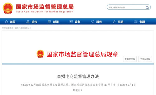 直播电商监督管理办法 (2025年12月18日国家市场监督管理总局、国家互联网信息办公室令第117号公布 自2026年2月1日起施行) 第一章 总 则 第一条 为了加强直播电商监督管理,保护消费者和经营者的合法权益,促进直播电商健康发展,根据《中华人民共和国电子商务法》、《中华人民共和国消费者权益保护法》、《中华人民共和国网络安全法》等法律,制定本办法。 第二条 在中华人民共和国境内从事直播电商活动以及市场监督管理、网信部门依据职责对其进行监督管理,适用本办法。 本办法所称直播电商,是指通过互联网站、应用程序等,以视频直播、音频直播或者多种直播相结合等形式销售商品或者提供服务的经营活动。 本办法所称直播电商平台经营者,是指在直播电商活动中提供网络经营场所、交易撮合、信息发布等服务,供交易双方或者多方独立开展交易活动的法人或者非法人组织。 本办法所称直播间运营者,是指在直播电商平台上注册账号或者通过自建网站、其他网络服务,开设直播间从事直播电商活动的自然人、法人和非法人组织。实际运营他人直播间的,也应当依照本办法规定履行直播间运营者的相应义务。 本办法所称直播营销人员,是指在直播电商活动中直接面向社会公众开展商品或者服务宣传、推介活动的自然人。 本办法所称直播营销人员服务机构,是指为直播营销人员从事直播电商活动提供策划、运营、经纪、培训和技术支持等服务的机构。 第三条 从事直播电商活动,应当遵循自愿、平等、公平、诚信的原则,遵守法律、法规、规章和商业道德、公序良俗,公平参与市场竞争,接受政府监管和社会监督,营造良好直播电商生态。 第四条 直播电商监督管理应当坚持鼓励创新、严守底线、线上线下一体化监管的原则,营造有利于直播电商健康发展的市场环境,充分发挥直播电商在推动高质量发展、满足人民日益增长的美好生活需要等方面的重要作用。 第五条 鼓励直播电商平台经营者、直播间运营者建立健全首问负责、先行赔付、在线争议解决等制度,及时预防和解决直播电商领域消费争议。 鼓励相关行业组织加强行业自律,建立健全行业规范,推动行业诚信建设,监督、引导本行业经营者公平参与市场竞争、自觉维护消费者合法权益。 鼓励消费者组织加强对直播电商活动的社会监督,维护消费者合法权益。 第二章 直播电商平台经营者 第六条 直播电商平台经营者应当建立健全直播账号注册注销、平台内交易行为规范、商品和服务质量保障、消费者权益保护、个人信息保护、网络和数据安全保护以及直播间运营者、直播营销人员、直播营销人员服务机构管理等机制。 直播电商平台经营者应当加强直播电商信息内容管理,建立健全内容审核机制,营造良好直播电商生态。 第七条 直播电商平台经营者应当遵循公开、公平、公正的原则,制定平台服务协议和交易规则(以下简称平台规则),明确直播电商平台经营者、直播间运营者、直播营销人员、直播营销人员服务机构等主体的权利和义务,并以显著方式提醒相关主体注意与其有重大利害关系的内容。 直播电商平台经营者应当在平台规则中要求直播间运营者、直播营销人员服务机构规范直播营销人员的招募、培训、使用、管理等工作。 第八条 直播电商平台经营者应当要求申请进入平台从事直播电商活动的直播间运营者提供其名称(姓名)、统一社会信用代码(身份证件号码)、实际经营地址、联系方式、行政许可等真实信息,进行核验、登记,建立登记档案,并至少每六个月核验更新一次。 直播电商平台经营者应当要求直播间运营者在直播营销人员首次直播前,提供经核验无误的该人员姓名、身份证件号码、经常居住地址、联系方式、所属直播营销人员服务机构以及与直播营销相关的专业资质、职业职务等身份信息,对直播间运营者履行核验义务提供技术支持并进行监督。 直播电商平台经营者应当建立并落实直播营销人员真实身份动态核验制度,不得为与真实身份不符或者依照国家有关规定不得从事直播电商活动的人员提供相关服务。 第九条 直播电商平台经营者应当分别于每年一月和七月向平台住所地省级市场监督管理部门报送直播间运营者、直播营销人员的下列身份信息: (一)已办理经营主体登记的直播间运营者的名称(姓名)、统一社会信用代码、实际经营地址、联系方式、直播账号等信息; (二)未办理经营主体登记的直播间运营者的姓名、身份证件号码、实际经营地址、联系方式、直播账号等信息; (三)直播营销人员的姓名、身份证件号码、经常居住地址、联系方式、所属直播营销人员服务机构以及与直播营销相关的专业资质、职业职务等信息。 第十条 直播电商平台经营者应当建立健全直播营销人员培训机制,每年对直播营销人员开展培训;在为首次从事直播电商活动的直播营销人员提供直播服务前,应当组织开展网络交易、网络信息安全相关法律、法规、规章以及产品质量安全、消费者权益保护、平台规则等方面的培训。直播营销人员不得在接受培训时弄虚作假或者拒不参加培训。 直播电商平台经营者应当每年组织直播间运营者、直播营销人员服务机构学习网络交易、网络信息安全相关法律、法规、规章,及时通报有关部门的工作要求。 第十