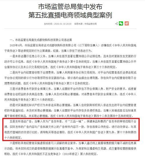 庶正观点 【直报网北京2月3日讯】(庶正康讯)政府干预的出发点是纠正市场失灵!我国营养健康市场长期徘徊在失灵临界点两侧,因此严格监管是优化营商环境的必要之举! 近年来,互联网广告形式发生变化,再加上精准推送、直播带货、内容种草、信息流深度植入等经营模式、投放方式等方面不断发展变化,多样性、多元性、广泛性的特征更趋明显。 国家市场监督管理总局近期公布了“十起违法广告典型案例”及“第五批直播电商领域典型案例”,不仅揭示了监管重点,更为行业敲响了合规警钟。 01.平台承担广告发布者主体责任 ![]() 庶正点评:此案强调了平台作为广告发布者的法定责任。平台必须建立与监管要求匹配的审核机制,对“三品一械”等特殊商品广告实施实质性审查,确保广告内容与批准文件一致。 02.跨境“保健品”广告违法被重罚 ![]() 庶正点评:虽然跨境电商渠道进口的食品作为“个人物品”在产品质量责任上可能与传统进口模式有差异(消费者风险自担),但其在中国境内进行的广告宣传活动,也必须遵守中国的广告管理规则。运营方明知是普通食品,却在中国市场宣传功能或治疗作用,是明确的违法行为。60万元的高额处罚,也是对跨境电商行业发出了一个重要警示。 03.以直播形式发布广告涉“病” ![]() ![]() 庶正点评:《直播电商监督管理办法》于2月1日落地施行,标志着直播营销正式迈入全链条合规新阶段。新规明确了直播内容构成商业广告的三种情形,通过厘清“广告”与“营销”的边界,从而在制度层面解决了监管不确定性问题。 04.普通食品广告违规仍是“重灾区” 除前述广告违法行为外,案例中不乏大量“保健品”(普通食品身份)夸大、虚假宣传的情况。 如: ![]() ![]() ![]() 庶正点评:普通食品宣传治疗功效、保健功能都是绝对禁区。无论营销形式如何翻新(短视频、私域社群、伪科普),任何试图“包装”或“暗示”疗效的做法都极其危险。监管部门的穿透式执法能力日益增强,任何隐蔽的渠道都难逃法眼。 END