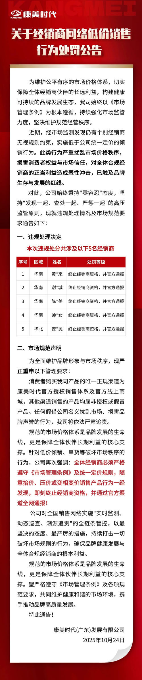 【直报网北京10月24日讯】(康美) ![]() (原标题:康美发布经销商网络低价销售行为处罚公告) 责任编辑:一一 【特别声明:部分文字及图片来源于网络,仅供学习和交流使用,不具有任何商业用途,其目的在于传递更多的信息,并不代表本平台赞同其观点。版权归原作者所有,如涉版权或来源标注有误,请及时和我们取得联系,我们将迅速处理,谢谢!】 解读新闻热点、呈现敏感事件、更多独家分析,尽在以下微信公号,扫描二维码免费阅读。