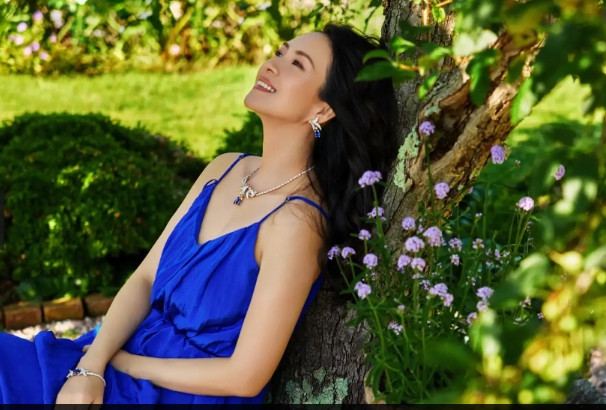 章子怡漫步美国橡树泉花园 穿蓝色吊带裙优雅迷人(5)