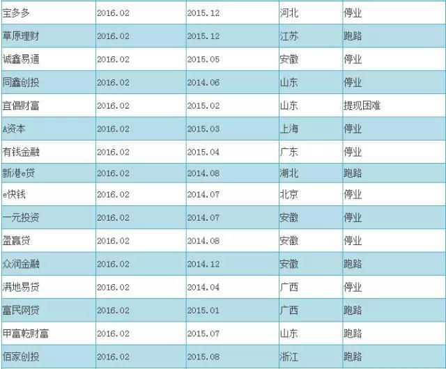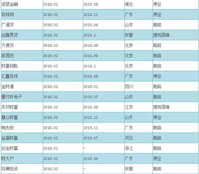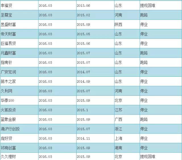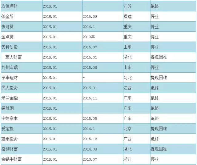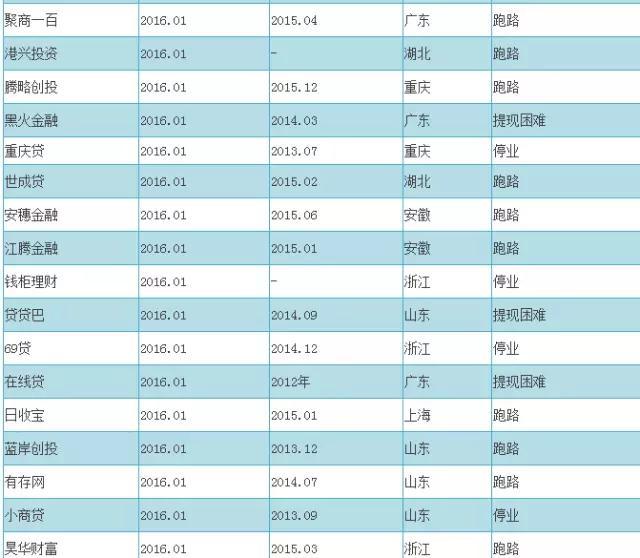 防患于未然——辨别P2P平台安全性 1、疯狂发标,尤其是短标:吸金欲望突然如此强烈的平台明显不正常。这有可能是平台在跑路前想要好好“捞一笔”的征兆。 2、长时间未发标:长时间没有更新标的,之后就没有下文了,甚至就直接消失了。 3、提现速度变慢:如果平台的提现时间突然间增长,则有可能是大部分资金被公司抽走导致的资金流动不畅,这也将是平台准备跑路的信号。 4、频繁更换办公地点:经常更换办公地点的平台,也是平台不正常经营的一种征兆,例如去年深圳e租宝的职场在半年内就更换了好几次。 5、拖欠员工工资:意味着平台的资金严重紧缺,那些发不出工资的平台,基本上会在两个月内出现大规模的兑付问题,继而跑路。 真正的P2P的确是不会跑路的,因为他只是一个信息中介!所以投资者们在投资的时候,一定要擦亮眼睛,抵御高息诱惑,远离非法集资。 1、投资回报率是否超过同期水平过多。天下没有免费的午餐,高收益或许是借贷方为迅速吸纳自己打出的幌子。 2 、投资资产信息是否存在披露不完整现象。投资人在投资前一定要对平台的资产信息进行全面调查,即了解平台在吸纳资金后的用途,资金流向问题。 3、是否过于夸大宣传无风险高收益误导投资者。但凡是投资几乎都是有风险的,一些问题平台宣传高收益的同时还宣扬无风险,典型的欺骗行为。投资者需冷静对待,对投资风险要有全面的认识。 4、第三方评级机构给予评价是否过低。投资者在进行投资前对平台要有全面了解,借助网络信息查询该平台是否有第三方机构进行过评级。评级过低必然存在问题。 5、是否实行资金第三方托管。正规的P2P平台都有着可持续发展的目标,会主动启用第三方资金托管服务,了解一个平台,看他有没有第三方资金托管,有没有和银行合作或者第三方支付机构合作是最直接的方法。 再看第二份名单!