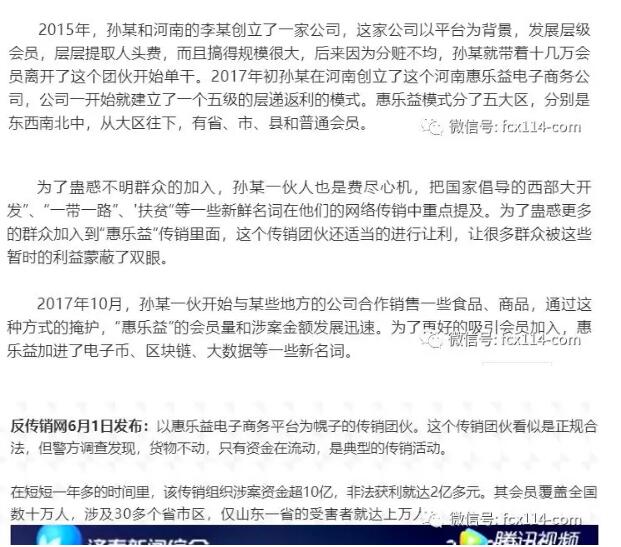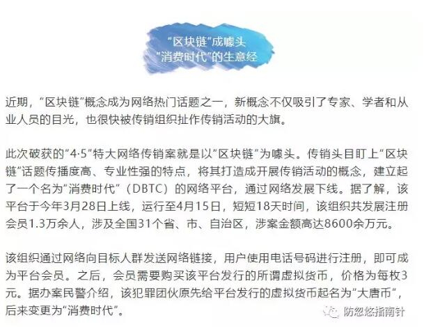 【直报网北京6月8日讯】(同城反传销联盟)近日有网友反馈资料如下: ![]() 一,什么是TXL(天星链): 【TXL】收益计算公式: 一.智能合约: 智能算力,持链产生利息,日复利,每天链生链 1-499链. 约0.16%/日 500-999链. 约0.21%/日 1000-2999链. 约0.26%/日 3000-4999链. 约0.31%/日 5000-9999链. 约0.36%/日 10000链以上. 约0.42%/日 举例:持链1万个,按照百分之0.42计算,每日生链是42个,复利倍增,每天价格单边上扬的情况下,每年纯静态15到85倍。 二.挖矿算力: 分享算力,可以获得小区持链总量按照相应算力匹配所得链 500-999链. 约0.16%/日 1000-2999链. 约0.21%/日 3000-4999链. 约0.26%/日 5000-9999链. 约0.31%/日 10000链以上. 约0.36%/日 (分享奖日封顶为投资链的50%,最高每天5000个链) 举例:小区持链总量为100万个,个人持链10000,动态按百分之0.36计算,则每日可以获3600个链的动态奖励,每个链15计算,每日赚54000元,若每个30元,每日赚108000*元,每月赚324万元。 三.分享算力: 每天还可以获得直接分享人一代动态收益的1%,二代2%. 举例:若最高收益5000链/天,按1%计算,则每日可以获得50个链的奖励,如果有10个直接分享人,则每日可获得500个链,按照15元计算,则每月可多获得225000元。 根据禁止传销条例国务院令第444号第七条 下列行为,属于传销行为: (一) 组织者或者经营者通过发展人员,要求被发展人员发其他人员加入,对发展的人员以其直接或者间接滚动发展的人员数量为依据计算和给付报酬(包括物质奖励和其他经济利益,下同),牟取非法利益的; (二) 组织者或者经营者通过发展人员,要求被发展人员交纳费用或者以认购商品等方式变相交纳费用,取得加入者发展其他人员加入的资格,牟取非法利益的; (三) 组织者或者经营者通过发展人员,要求被发展人员发展其他人员加入,形成上下线关系,并以下线的销售业绩为依据计算和给付上线报酬,牟取非法利益的。 根据我国禁止传销条例,该模式的奖金制度和禁止传销条例有冲突。 不久前中国消费者报报道的《区块链”传销骗局正猖狂 传销币骗局不断上演》,该诈骗组织以传销手法,区块链,虚拟币等噱头忽悠老百姓投资参与,短短18天就圈钱8600万. ![]() 还有最近警方破获的“惠乐益”公司也是以区块链为旗号诈骗老百姓金额达10亿元。 ![]() 最终民警了解到“惠乐益”传销团伙的多名头目有向郑州聚集的趋势,专案组决定马上收网。 摸清他们的活动轨迹后,专案组民警在河南省厅经侦总队、郑州市经侦支队的协助下,两地统一指挥、联合用警,在郑州当地一饭店会议厅内将传销组织会场全面控制,当场将主犯、发起人、公司负责人等10余名犯罪嫌疑人一举抓获,现场控制参与传销人员100余人,摧毁了惠乐益公司这一网络传销平台。 与此同时另外几路民警,先后在北京、济南、太原、天津等地同时行动,整个传销团伙的其他骨干核心全部到案。截止到目前,共有14名核心人物被抓获归案,初战告捷。