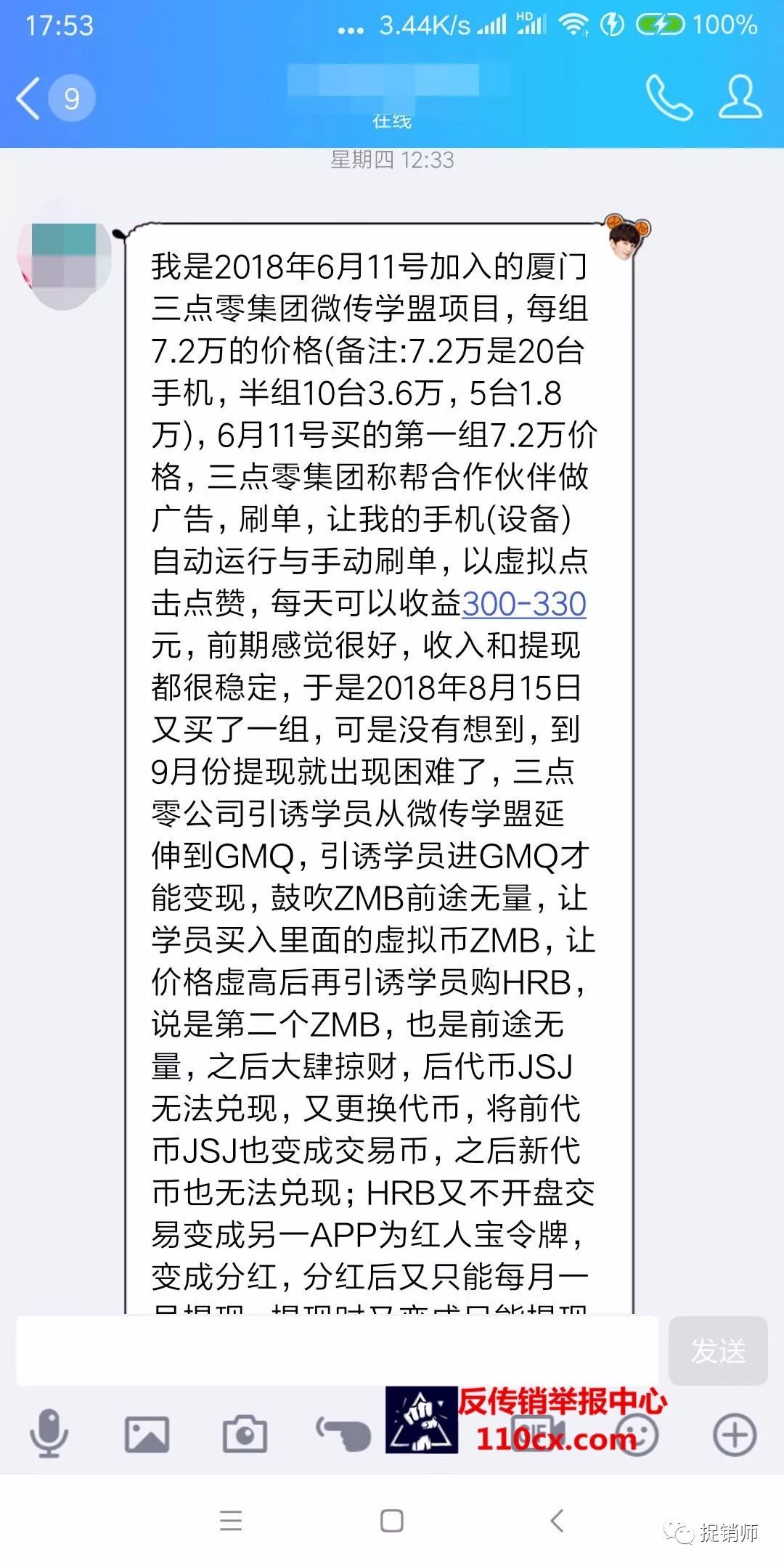 近日,本网收到关于厦门三点零公司的受害人丁先生的举报维权材料如下: ![]() 我是2018年6月11号加入的厦门三点零集团微传学盟项目,每组7.2万的价格(备注:7.2万是20台手机,半组10台3.6万,5台1.8万),6月11号买的第一组共计7.2万。 三点零集团称帮合作伙伴做广告,刷单,让我的手机(设备)自动运行与手动刷单,以虚拟点击点赞,每天可以收益300-330元,前期感觉很好,收入和提现都很稳定,于是2018年8月15日又买了一组。 ![]() 可是没有想到,到9月份提现就出现困难了,三点零公司引诱学员从微传学盟延伸到GMQ,引诱学员进GMQ才能变现,鼓吹ZMB前途无量,让学员买入里面的虚拟币ZMB,让价格虚高后再引诱学员购HRB,说是第二个ZMB,也是前途无量,之后大肆掠财。 ![]() 后代币JSJ无法兑现,又更换代币,将前代币JSJ也变成交易币,之后新代币也无法兑现;HRB又不开盘交易变成另一APP为红人宝令牌,变成分红,分红后又只能每月一号提现,提现时又变成只能提现20%,80%等三点零集团回购。 发觉情况不对,我没有选择加入GMQ,ZMB,JSJ等项目。向公司提出退款要求也一直没有得到答复。 |