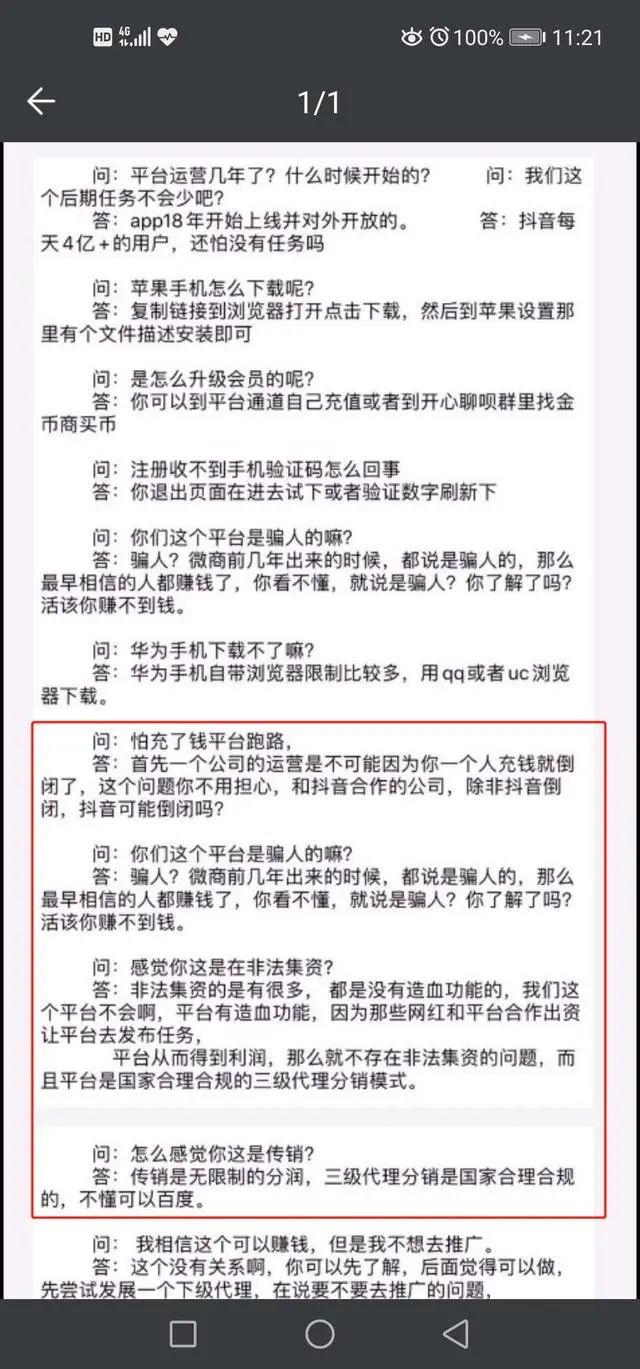 传销手法 专骗宝妈 雷达财经调查发现,抖加只是众多“点赞”骗局的一个缩影。"刷赞App"已形成一条暗黑产业链。这些App虽然图标、名称各有不同,但App的内容界面极其相仿。 雷达财经调查发现,此类App一般是通过朋友圈、QQ群、微博等渠道散发广告,吸引客户加入其中,并以群公告等形式发布下载链接。而完成下载注册的成员,则需要领取为抖音博主关注点赞的任务,每单佣金约为2元,但在不充值VIP会员的情况下无法提现。 以"南方易赞"为例,群管理员在拉人进群后会在群中发布信息标明会员档位:非会员一天3单赚5.7元;白银199会员一天8单15.2元,黄金499会员一天20单38元,钻石999会员一天40单76元,黑钻2199会员一天88单167.2元。 管理员还会亲自为成员们算一笔账:按非会员的赚钱速度35天即可攒到升级白银会员的会费,之后满50即可提现,每四天可以提现一次;黄金会员每两天提现一次,钻石会员及以上每天都可提现。充值会员后,14天即可开始回本赚钱。 除此之外还有首充奖励、提现翻倍卡等活动,会员等级越高,奖励越大。 与此同时,平台还打出"加入会员,轻松躺赚"的口号,试图在各种渠道招募新人、发展下线,只要拉进来的下线完成点赞任务,佣金提成便直接到账。新人所充值的会员等级越高,老会员的提成就越多。 具体来讲,推荐人在成为VIP会员后,成功邀请他人成为会员,即可返佣下级充值金额的一级18%,二级5%,三级2%。返佣只能拿到同级别的,低等级拿不到高等级的全部返佣。 群管理员还指导用户下载开心聊呗,来发布额外任务,并对"点赞员"进行统一管理。据雷达财经了解,开心聊呗的群规模或在千人以上。 群中不时有人发着收到平台转账交易成功的截图,还有群友表示会和大家一起努力成长、赚钱。群主管曾分享股神巴菲特的名言:"一旦你有了省钱的脑子,就不会有精力培养一个挣钱的脑袋,所以,你穷得很稳定!他们坚信,兼职做好了收益完全可以超过主业。" 当有人在群里问"这个是新软件还是一直都有?"群主管给出了"两年"的答案,随后有群成员立即晒出了过往的收益履历,其中的金额具有相当大的诱惑力。 而对于"非法集资"、"传销"等常见问题,群主也曾发布过官方的解释。 如此轻松的赚钱方式,令不少人趋之若鹜,这其中又以宝妈和学生党为主。雷达财经发现,在以"抖音点赞"为名的微信群中,还大量存在着其他广告群体,多数以不收押金、会费为噱头吸引用户,有的广告商甚至明确在宣传中表示,旗下兼职招收人群以宝妈及家庭主妇为主,有经验者优先。 "我认为这种行为也是一种传销,是法律法规所不允许的,只是变换个方式而已。"闫创律师表示,国务院2005年就曾出台《禁止传销条例》,禁止通过发展下线,设置层级等行为来牟利。" |