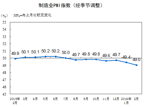 【直报网北京3月2日讯】(人民网)国家统计局日前发布了中国制造业和非制造业采购经理指数。数据显示,2016年2月份,中国制造业采购经理指数(PMI)为49.0%,低于上月0.4个百分点;非制造业商务活动指数为52.7%,虽比上月回落0.8个百分点,但继续位于扩张区间。 制造业采购经理指数有所回落
