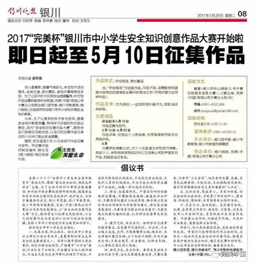 【直报网北京5月10日讯】(完美)未成年人是祖国的希望、未来的栋梁,近日,完美宁夏分公司联合银川团市委、银川市教育局、银川日报社共同发起倡议,以“安全知识创意作品大赛”方式,在银川市中小学校进行安全教育知识学习,鼓励学生们发挥主观能动性,用创意作品为身边的小伙伴们作出安全提醒。 宁夏分公司多年来一直积极关注未成年人安全教育问题,关爱未成年人健康成长,积极传播安全教育理念。为了让孩子们健康快乐成长,针对日常安全问题提高警惕,科学规避安全事故,提高学生和家长的安全意识及自我防护、救护能力,分公司至今已连续三年在银川市开展“完美杯中小学生安全知识学习竞赛活动”。该公益活动得到各级政府部门的肯定与支持,获得了社会广泛好评。 ![]() ![]() 学生作品 “2017完美杯银川市中小学生安全知识创意大赛”于3月28日正式拉开帷幕,已在《银川晚报》先后进行了五期刊登,目前活动正在如火如荼进行中。银川市中小学生在学校领导与老师的组织指导下,认真学习相关安全知识,积极自主创作出主题鲜明的优秀作品。 ![]() ![]() 学生作品 本次活动在培养孩子们认真学习安全知识的同时,也挖掘出孩子们绘画与文字创作的天赋。为了鼓励孩子们的学习及创作热情,活动后期将评选出优秀创作奖、优秀指导老师奖、优秀组织奖三个奖项。