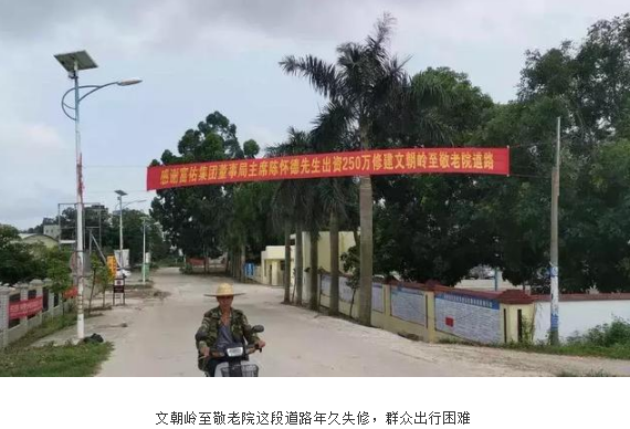 化州市杨梅镇文朝岭至敬老院这段道路由于年久失修,每每遇上雨水季节,道路总是泥泞不堪,导致群众出行困难,车辆无法正常行驶,而这也成为制约着镇敬老院各项工作开展、家乡经济建设以及与外界进行沟通交流的拦路虎。因此,乡贤陈怀德先生深入群众之中,倾听群众意见,了解群众疾苦,尽力为群众排忧解难,并牢记在心里,他提出将全额出资共250万元人民币对该段道路进行“硬底化”升级,升级后的该段道路将有效改善广大群众的出行环境,为乡亲出行保驾护航,助力发展化州、发展杨梅。