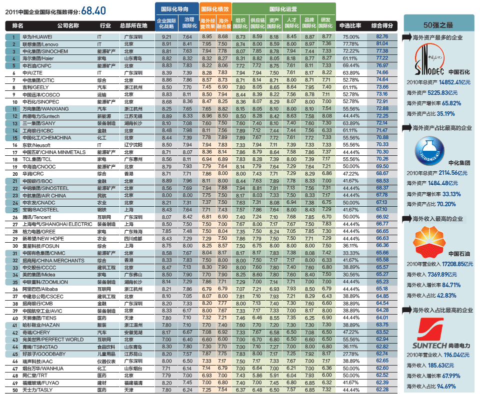 直报网北京10月12日电(记者发自金士力的报道)2011年9月20日,《中国企业家》杂志首度推出中国企业国际化指数排行榜,天士力与同仁堂作为仅有的2家医药企业入围上榜,荣膺“2011中国企业国际化50强”。 此次评选,由《中国企业家》杂志邀请中国社会科学院世经所世界华商研究中心、联合国贸易和发展组织(WTO)、日内瓦国际贸易和可持续发展中心等机构共同完成。 评选历时9个月,从国际化导向、国际化运营、国际化绩效三个维度,以及企业国际化战略、治理国际化、组织国际化、供应链国际化、资产国际化、人才国际化、品牌国际化、研发国际化、海外经营效果、海外融合度共10项权重指标对中国企业500强、中国进出口公司100强、中国各行业海内外重点上市公司等数百家重点企业进行了综合评估。 本次中国企业国际化50强的排名,采用了专家意见评分法,根据评委对候选企业十个单项指标的打分计算。每项满分为10分(总分为100分),分为10个级别。同时,还引入中选比率,即每位候选企业的得票比率。“综合得分”由评委直接打分和候选企业的中选比率加权计算,其中各项指标得分与中选比率在“综合得分”中所占比重分别是7:3。 通过专家评委打分,最终筛选出国际化50强,并于2011年9月27日—28日在瑞士日内瓦高层中国论坛正式发布。 “2011中国企业国际化50强”部分入选企业榜单如下: 1.华为/HUAWEI 2.联想集团/Lenovo 3.中化集团/SINOCHEM …… 5.中石油/CNPC …… 14.中国工商银行/ICBC …… 36.阿里巴巴/Alibaba …… 48.同仁堂/TRT …… 50.天士力/TASLY▲ |