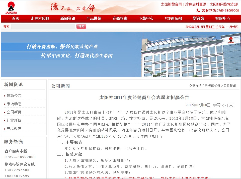 直报网北京2月15日电(本站记者报道)记者从太阳神官方网站获悉,2012年3月18日,太阳神将在东莞国际会展中心举办“同享阳光超越梦想”——2011年度广东太阳神集团经销商年会。同时,为了充分展现太阳神人良好的精神风貌,确保年会的顺利召开,并为团队培养一批会议组织人才,公司决定从广大经销商中招募150名大会志愿者。具体内容如下: 一、主要职责 年会期间的礼仪接待、秩序维护、会务等工作。 二、招募对象 1.认同太阳神理念、热爱太阳神事业; 2.为人热情大方,工作认真负责,态度积极,执行力、组织性、纪律性强; 3.能履行志愿服务的承诺,服从安排; 4.限四星商务中心或四星珍珠店(以实际注册为准),商务主任以上级别优先考虑; 5.男士身高1.65米以上,女士1.58米以上,身体健康,年龄在38岁以下; 6.礼仪要求:女,1.60米—1.65米,形象气质佳,身材匀称,微笑甜美,举止端庄,具有亲和力。须上传全身生活照片3~5张,年龄不超过28岁,有礼仪经验者优先。(如在团队会议中做过礼仪的请备注)。 三、招募人数 共计150人,其中男100人,女50人(含礼仪30人)。 四、报名时间及报名方式 请在2012年02月10日—02月29日期间,登录《我的商务中心》平台——“我的业务”栏——“志愿者申请表”填写并提交,审核通过的志愿者名单将在2012年03月02日公布。 五、报到时间及地点 凡被录用的志愿者,请于2012年03月14日13:00—16:00期间到公司市场部(广东省东莞市南城区胜和广场A座11楼)报到,往返公司的交通费用自理。 六、志愿者待遇 1.为期三天的丰富的会务基础知识、操作技巧等专项培训课程; 2.近距离、多角度、全方位欣赏、参与、体验万人年会的台前幕后; 3.在服务期间由公司提供免费食宿。 七、招募咨询 请致电0769-38999555,转市场部陈老师。▲ |