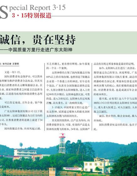 直报网北京4月14日电(本站记者报道)记者从太阳神官方网站获悉, 24年来,太阳神作为中国保健品行业的开拓者和先行者,无论是在辉煌时期,还是在低谷阶段,始终秉持对消费者高度负责的态度,坚持诚信经营,重视产品质量。也正是这样一个有责任感、使命感的企业,经受住中国保健品市场风起云涌的考验,迎来了二次腾飞的创业良机。 2012年3月15日前夕,《中国质量万里行》杂志记者王黎明走进广东太阳神,深入采访了太阳神执行董事、副总经理潘皓皓、产品部经理李凤芝、产品规划经理毛成文博士、质管部经理梁倩玲、太阳神保健品生产基地厂长彭国良,并通过对企业品牌形象,核心竞争力,研发实力,质量管理,拳头产品,多方位营销和未来的拓展追求等方面的剖析,推出了题为“诚信,贵在坚持——中国质量万里行走进广东太阳神”的3•15特别报道,详解了太阳神24年的创业历程。 《中国质量万里行》作为由国家质量监督检验检疫总局主管、中国质检报刊社主办的权威刊物,在国际消费者权益日这样一个特殊的日子里肯定了太阳神一直以来所坚持的诚信经营以及对消费者高度负责的企业宗旨,也揭示了太阳神二次创业,再续辉煌的深层次原因…… 诚信,贵在坚持 ——中国质量万里行走进广东太阳神 又是一年3·15。 国际消费者权益保护日,可以简单地理解为维护消费者合法权益,但其实质是以消费者的名义鞭策激励企业,在企业、商家和消费者之间建立以法律为基础,以道德为底线的和谐消费生态环境。 可以肯定地说,百年企业,客户体验是根本。 广东太阳神集团有限公司(以下简称太阳神),这家以保健品为主打方向的公司,在尊重消费者的道路上前进了24个年头。 国内保健品市场,向来风起云涌,不乏弄潮儿。更有曾经辉煌,如今落寞的一个又一个案例。 太阳神曾经占领了国内保健品市场60%以上的市场份额,也曾创造了保健品企业第一个香港上市的神话。至今还有个说法,广东甚至全国保健品销售总监中,大部分都曾为太阳神服务。进入上世纪90年代中期后,太阳神也曾沉寂。可贵的是,进入21世纪后,太阳神经过凤凰涅槃,浴火重生,又一次响彻大地。 3·15前夕,中国质量万里行走进广东太阳神,试图通过媒体人的眼光剖析太阳神再次腾飞的原因何在。 其实,原因很简单,以产品为导向,向消费者提供安全、可靠、有效的产品是太阳神再次腾飞的根本。24年来,太阳神产品没有出现过质量丑闻,这便是最好的证明。 如今,太阳神人正在进行二次创业,期望通过自己的努力,再创辉煌。广东太阳神集团有限公司执行董事、副总经理潘皓皓告诉记者,质量和信誉是太阳神再次腾飞的核心,我们要做的就是坚持,对消费者负责,也是成就百年企业的根本所在。 德不孤,必有邻!这六个字与太阳神的LOGO并列出现在太阳神官方网站上。爱人者人恒爱之,对人以诚信,人亦报之以诚信。 诚信,贵在坚持。做企业如此,做人亦如此。 国际消费者权益日的真谛,也在于此。 解读太阳神 上世纪八十年代末,改革开放的“桥头堡”珠三角地区熙熙攘攘,闭塞数十年的计划经济因改革开放而热闹非凡,商机涌动。办企业,是有志之士惟一的目标。 当时,保健品还是药品的附属产品,但太阳神的创始人怀汉新敏锐地察觉到其市场的巨大。于是,中国第一个保健品企业——广东太阳神集团公司在1988年成立了,怀汉新因此获得中国保健品教父之称号。 自1988年成立开始,太阳神以惊人的速度发展壮大,仅短短5年的时间,“太阳神”成了妇孺皆知的品牌。在1993年的巅峰时期,太阳神更是创下63%的市场占有率奇迹。 进入上世纪90年代中期后,太阳神的发展开始走下坡路。没有了太阳神的一枝独秀,国内保健品市场进入各领风骚的群雄混战局面。 进入21世纪,沉寂数年的太阳神悄无声息地在凤凰涅槃后重生,再次步入国内保健品行业前列,有人感叹这是市场的奇迹,也有人怀疑太阳神还能坚持辉煌多久?而太阳神人在质疑面前没有多言,只是一如既往地脚踏实地做事,因为他们坚信,惟有对质量信誉的坚持,惟有以产品为导向的公司,才能始终笑傲江湖。 解读太阳神再次辉煌,不能不从企业品牌形象、核心竞争力、研发实力、质量管理、拳头产品和多方位营销等几个方面入手。 成功导入CI,打造“太阳神”品牌 1988年,太阳神集团正式导入CI(企业形象识别系统)战略,成为中国大陆最早展开这项工作的第一家企业。 毫无疑问,成功的市场开拓为“太阳神”品牌的建立奠定了坚实的基础,但是真正品牌形象的建立则离不开成功的广告推广和CI的导入。 太阳神集团早期广告是以引起注意力为主要诉求目标,当时“太阳神”口服液在社会上知名度不高。为此,太阳神集团果断采取推出一系列大型社会活动的广告行为,通过参与和支持社会公益活动,树立企业形象,扩大品牌影响,在当时可谓独树一帜。 当“太阳神”已为人们所普遍认识的同时,公司大的市场战略布点已经完成。让人们了解太阳神口服液的功能,进而在情感上接受它,便成为这一阶段广告诉求的新目标。 1993年以后,太阳神集团开始了广告推广策略的调整。由过去企业、商标、品牌三位一体,以凸现企业形象为主逐步转向以凸现品牌形象、以功能诉求为主要目标的广告策略。这个阶段,太阳神集团的CI实践的内涵已大大突破了传统CI理论所涵括的范围,其CI识别系统除