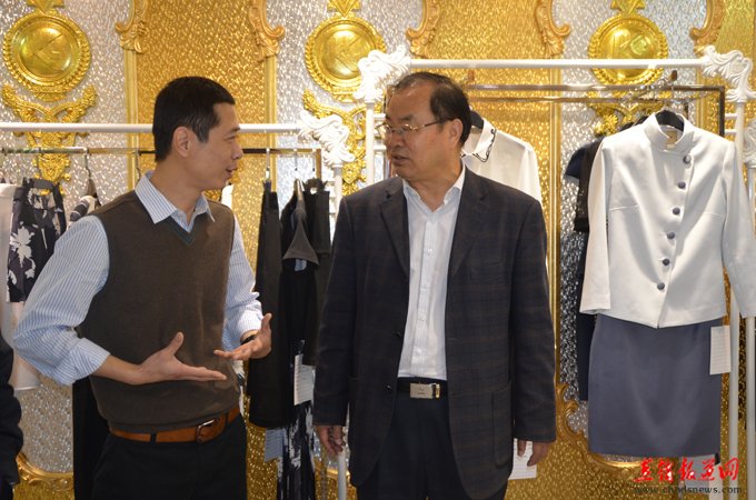图为荣格服装有限公司副总经理李永曙向陈佰禄局长介绍荣格服装设计理念