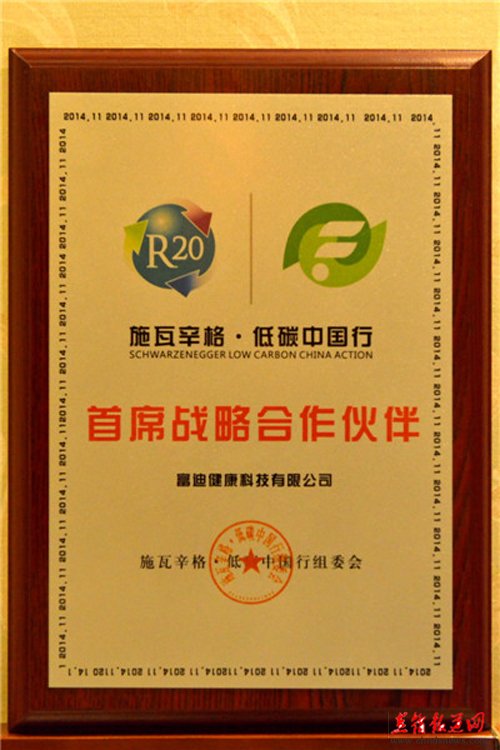 “施瓦辛格•低碳中国行”首席战略合作伙伴牌匾 另一方面,在领航人陈怀德先生的带领下,富迪公司自成立以来秉承“大爱无边”的企业文化理念,专注绿色生活,坚持诚信守法经营,并重金聘请一大批行业尖端科技人才组成杰出的科研团队,不断结合国际先进技术,全方位、多角度观察消费者的各种需求,精益求精、努力不懈地进行高品质产品研发,使绿色健康的多元化产品源源不断地洒向中国大地。 正是富迪公司在低碳环保领域的突出贡献,得到了施瓦辛格先生及R20的高度关注和重视,力邀富迪公司成为“施瓦辛格•低碳中国行”大型公益活动的首席战略合作伙伴,并邀请陈怀德先生参与此次在四川南充举行的“施瓦辛格·低碳中国行”大型公益活动。 |