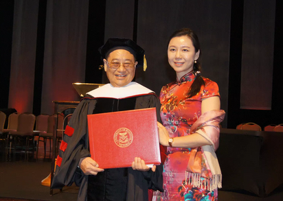 吴炳新与夫人合影 经过休斯顿大学学术委员会长期观察、研究和评估,委员会一致认为吴炳新先生30多年的理论与研究,为人文科学作出了重大的贡献。休斯顿大学史无前例地把人文科学博士的学位授予了吴炳新先生,他也因此成为了全世界华人得到这个荣誉学位的第一人。 |