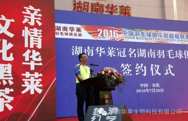 著名歌唱家贺双桃女士独唱《你来的正是时候》 在“湖南华莱冠名湖南羽毛球俱乐部签约仪式”上,湖南华莱生物科技有限公司总裁张先枚和湖南省羽毛球乒乓球运动管理中心主任,省羽毛球协会副主席、秘书长唐辉在各级领导、各界人士的共同见证下进行签约。湖南省人大常委会原党组书记、湖南省羽毛球协会名誉主席李江,中国宋庆龄基金会基金部部长、湖南省羽毛球协会副主席唐九红,湖南省体育局副局长、省羽毛球协会名誉副主席熊倪,益阳市人民政府副市长黄东红,省羽毛球乒乓球运动管理中心副主任彭碧生,中共湖南省委党校后勤处处长、省羽毛球协会副秘书长邓冬荣,益阳市文体广新局副局长徐志成,中共安化县委副书记、县长熊哲文,县委副书记王新宇,县人大常委会主任蒋跃登,县政协主席李太源,羽毛球奥运冠军、湖南省羽毛球队副总教练田卿,篮球世界冠军郑海霞,网球奥运冠军李婷,湖南华莱生物科技有限公司董事长陈社强共同见证了这一重大时刻。