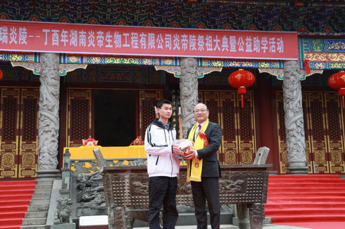 祭祖大典后进入公益助学环节,黄佳林董事长代表炎帝生物向炎陵县贫困学童捐献150万元助学基金,炎陵县人民政府副县长沈红星女士代表炎陵县接受捐款并回赠捐献证书;厉农帆副总裁代表炎帝生物向炎陵县捐献5万元青少年关爱基金,共青团炎陵县委书记谭慧林代表炎陵县接受捐款并与厉总合影留念。