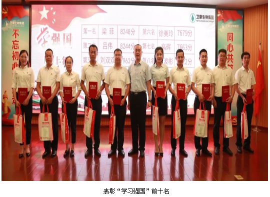 表彰先进•学习榜样 作为高新技术产业开发区成立的首家企业党委,卫康生物党委的党员纷纷投身“学习强国”之中,掀起了“学习强国”的热潮。 会议中,党委副书记 杜广青宣读了关于表彰集团学习强国分数前十名的表彰决定并予以表彰,同时,对集团优秀退伍军人进行了表彰。