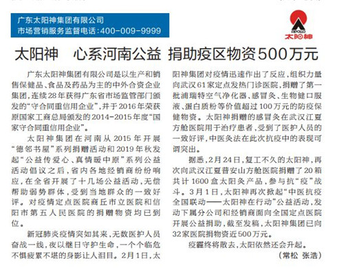 【直报网北京3月17日讯】(太阳神)疫情无情人有情,在这场抗“疫”的爱心接力赛中,太阳神一直在秉持着自己的历史使命,承担着一个民族企业应有的责任,自2月1日起,太阳神积极联系前方、捐赠保健物资、爱心款项、多批物资陆续抵达,守护一线”天使“。 ![]() 时值3.15,《河南日报》对太阳神此次公益事件作出报道,文中称: 疫情面前既照耀出人性的光芒,也考验着企业的责任与担当。疫情当前,多数直销企业在这生存和发展的关键时期,向疫区纷纷伸出援手。其中,太阳神捐助物资500多万元,为政府分忧解难,为人民扶困济危,促进了社会和谐发展。 ![]() 全文如下: 太阳神心系河南公益捐助疫区物资500万元 广东太阳神集团有限公司是以生产和销售保健品、食品及药品为主的中外合资企业集团,连续28年获得广东省市场监管部门颁发的“守合同重信用企业”,并于2016年荣获原国家工商总局颁发的2014-2015年度“国家守合同重信用企业”。 太阳神集团在河南从2015年开展“德邻书屋”系列捐赠活动和2019年秋发起“公益传爱心、真情暖中原”系列公益活动倡议之后,省内各地经销商纷纷响应,在全省开展了十几场公益活动,无偿帮助弱势群体,受到当地群众的一致好评。对疫情定点医院商丘市立医院和信阳市第五人民医院的捐赠物资均已到位。 新冠肺炎疫情突如其来,无数医护人员奋战一线,夜以继日守护生命,一个个临危不惧疲累不堪的身影让人泪目。2月1日,太阳神集团对疫情迅速作出了反应,组织力量向武汉61家定点发热门诊医院,捐赠了第一批浦瑞特空气净化器、感冒灸、生物健口服液、蛋白质粉等价值超过100万元的防疫保健物资。太阳神捐赠的感冒灸在武汉江夏方舱医院用于治疗患者,受到了医护人员的一致好评,中医灸法在此次抗疫中的表现可谓突出。 据悉,2月24日,复工不久的太阳神,再次向武汉江夏普安山方舱医院捐赠了20箱共计1600盒太阳灸产品,参与抗“疫”战斗。3月1日,太阳神再次掀起“中医抗疫全国联动——太阳神在行动”公益活动,发动下属分公司和经销商面向全国定点医院开展公益捐助,截至发稿,太阳神集团已向32家医院捐物资近500万元。