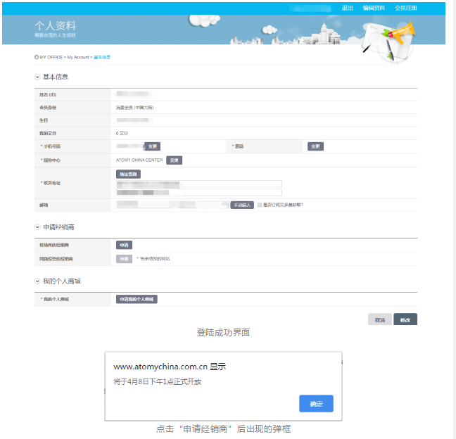 目前,成功注册的消费会员,已经可以在官网进行正常登陆。在个人资料“基本信息”下,就有一项“申请经销商”的选项,点击申请之后会出现弹框消息——“将于4月8日下午1点正式开放”。