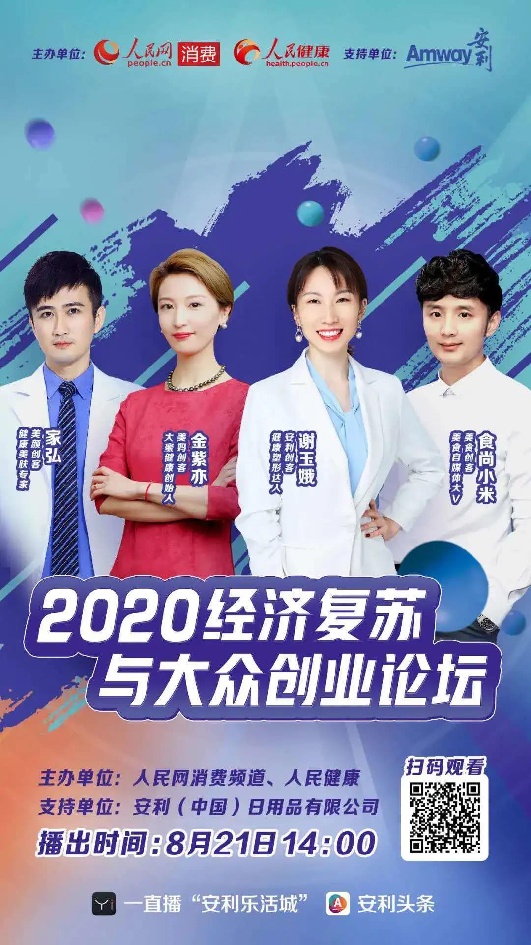 全职妈妈也可以是职业女性,将兴趣变现、让生活焕新,美妈创客金紫亦将与我们一起挖掘自己的兴趣与渴望,寻找创业方向,实现自我价值。 热爱美食是本性、创造美食是兴趣、分享美食是日常,美食创客食尚小米,带你从平凡的三餐中发现不平凡的热爱,开发兴趣,玩转生活。 用自己的专业度焕活那些鲜活的面孔,让自信与美丽贯穿生活,美颜创客家弘,与我们一道发现美、探索美、创造美,用兴趣与专注成就事业。 值得一提的是,我们的安利创客谢玉娥也将作为健康塑形达人亮相,分享自己依托安利平台实现创业梦想的秘诀!从健身爱好者,到成为一名健康塑形达人,安利在每位怀揣梦想的“创玩家”的人生中充当了怎样的角色?又能给予怎样的帮助?通过直播一起来探秘吧! 60多年来, 安利为每一位奋斗中的创业者们, 提供更大的舞台与更多实现梦想的机会。 8月21日14:00 “2020经济复苏与大众创业论坛” 将同时在人民健康APP、 一直播安利乐活城、 安利云直播平台同步直播, 请大家锁定频道,轻松创业、玩转生活!