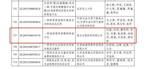 【直报网北京4月22日讯】(福瑞达)近日,中国专利奖评审办公室发布《第二十三届中国专利奖评审结果公示》,焦点福瑞达发明专利《一种速溶透明质酸钠制备方法》(专利号ZL201910841457.8)荣获中国专利优秀奖。 ![]() ![]() 中国专利奖,是由中国国家知识产权局和世界知识产权组织共同主办的,是中国唯一的专门对授予专利权的发明创造给予奖励的政府部门奖,其所获奖项得到联合国世界知识产权组织(WIPO)的认可。 《一种速溶透明质酸钠制备方法》(专利号ZL201910841457.8)其技术在于将透明质酸钠溶液与低分子透明质酸钠或壳聚糖进行构架后,通过添加乙醇溶液,将两因素产生协同效应,并经过低压真空环境中冷冻干燥获得了一种速溶透明质酸钠。有效的解决了机械粉碎对透明质酸钠的结构产生的破坏,并实现优越的速溶性效果,同时,很好的解决了水溶剂中极易染菌,以及储存和保藏需要加入大量防腐剂的问题。促进了透明质酸钠生产工艺技术的革新、升级,更好的体现了焦点福瑞达在推动关键核心技术攻关方面取得的突出成效。 ![]() 多年来,焦点福瑞达在加强研发、推进产学研合作的基础上,不断加强专利和技术创新工作,专利数量和质量得到进一步提升,技术创新工作不断取得新的突破。先后被认定为国家高新技术企业、国家专精特新“小巨人”、山东省瞪羚企业、山东省隐形冠军等。