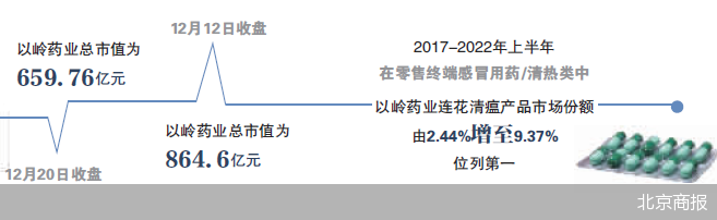 “连花”伤肝?以岭紧急声明 以岭药业日前风波不断,网络上出现“山东某医生在社交平台称,一上午接诊3个因服用连花清瘟造成急性肝损伤的病人”的消息,随后“以岭药业回应连花清瘟损伤肝脏”的话题登上微博热搜。 针对连花清瘟可造成肝损伤、肝衰竭的消息,以岭药业12月18日发布关于连花清瘟安全性的声明。声明表示,网络谣言称连花清瘟可造成肝损伤、肝衰竭,此类不实消息严重误导了广大民众,严重损害了连花清瘟的产品形象,造成了极其恶劣的社会影响。 以岭药业在声明中从系统毒理学研究、临床研究不良反应的荟萃分析等方面对连花清瘟的良好安全性进行了澄清。声明称,连花清瘟从组方用药历史、上市后大规模人群中不良反应监测等多方面均证实有良好的安全性。针对失实言论和恶意诋毁,公司保留通过法律手段维护自身合法权益之权利。 12月20日,关于“连花清瘟是否能与布洛芬连用”“以岭药业市值近一周蒸发185亿元”的话题也引发热议。据悉,有关报道提出,连花清瘟联合布洛芬使用会增加肝损害风险,科学合理用药可减少和避免毒副作用的发生。 对此,以岭药业在投资者互动平台上回应称,连花清瘟可以与解热镇痛药物(如布洛芬)联用,但需重点关注是否存在解热镇痛药物使用禁忌情况,在医师指导下联合使用。一项针对112例儿童的连花清瘟和布洛芬颗粒等西药联合应用的临床研究,结果显示联合应用与单用布洛芬颗粒西药不良反应发生率无差异,未见肝肾功能损伤。 核心单品撑起四成营收 连花清瘟已成为以岭药业产品版图中的核心大单品,在贡献超40亿元营收后,连花清瘟的营业占比已达到40.15%。 2020年以前,心脑血管类产品一直是以岭药业的第一大营业收入来源。2019年,心脑血管类产品营业收入达到30亿元,占公司营业收入的53.15%。2020年4月,国家药品监督管理局批准连花清瘟胶囊/颗粒在原批准适应症的基础上,增加“新型冠状病毒肺炎轻型、普通型”的新适应症。至此,以岭药业包含连花清瘟胶囊在内的呼吸系统类产品的营业收入出现强势增长。 根据以岭药业方面披露,2021年,公司连花清瘟产品实现营业收入40.6亿元,占公司总营业收入的40.15%。2017-2021年以及2022年上半年,在零售终端感冒用药/清热类中,公司连花清瘟产品市场份额由2.44%增至9.37%,位列第一。 经济学家宋清辉在接受北京商报记者采访时曾表示,依赖单一产品会导致企业抗风险能力薄弱。在连花清瘟近日的质疑声中,以岭药业的总市值已跌去200亿元。截至12月20日收盘,以岭药业收跌2.9%,总市值为659.76亿元。 针对公司市值波动以及连花清瘟质疑等问题,北京商报记者联系了以岭药业方面,但截至发稿未收到回复。在一位业内人士看来,前一段时间以岭药业涨得比较厉害,这算是股价的正常调整。 除了以岭药业下跌外,12月20日中药概念股全线走低,截至北京商报记者发稿,陇神戎发、太龙药业、龙津药业、红日药业、香雪制药以及康芝药业分别下跌1.46%、3.89%、5.58%、3.17%、4.37%、2.14%。