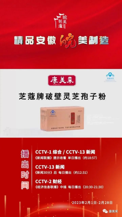 【直报网北京2月3日讯】(康美来)2月1日,康美来破壁灵芝孢子粉登陆央视CCTV1、CCTV新闻、CCTV2等黄金频道播出广告,这是继2022年11月后时隔2个月再次在央视三个黄金频道黄金时间推广公司和产品,以“精品安徽”大品牌的形象广告全国。 ![]() ![]() 本月广告一个显著的变化是增加在央视CCTV1、CCTV新闻频道“新闻联播”前插播企业宣传广告(单日),提升康美来公司知名度。“精品安徽”由省政府有关部门统筹安排助力企业推广“皖美制造”,支持专、精、特、新品牌产品市场推广,支持企业做强做大。新春伊始,央视广告的播出,彰显在各级政府的大力支持下,康美来的春天来了! “精品安徽 皖美制造”15s播放在CCTV-1、CCTV-13《新闻联播》前