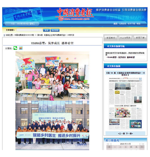 USANA葆婴在经营发展的道路上开拓出一条专属于自己的可持续发展路线——希望通过人、地球和产品三方面的持续努力,在健康公益、环境治理等践行企业社会责任的过程中引领先锋。 自2015年优莎纳公益基金落地中国至今,USANA葆婴牵手中国乡村发展基金会,先后参与天使之心儿童先心病救助项目以及爱加餐项目,帮助先心病患儿获得手术机会,为欠发达地区的孩子提供爱心营养加餐,使他们拥有健康的身体及幸福的童年。 而在国家乡村振兴的战略背景下,USANA葆婴积极响应国家政策,又成为首批响应天使工程的企业,于2023年1月启动优莎纳公益基金乡村天使项目,旨在改善欠发达地区医疗设施条件,赋能乡村医生,为乡村百姓健康贡献力量。 USANA葆婴数年来积极践行企业社会责任的种种善举,在3月15日于《中国消费者报》“直销企业保护消费者权益3·15特刊”中进行了深度报道: