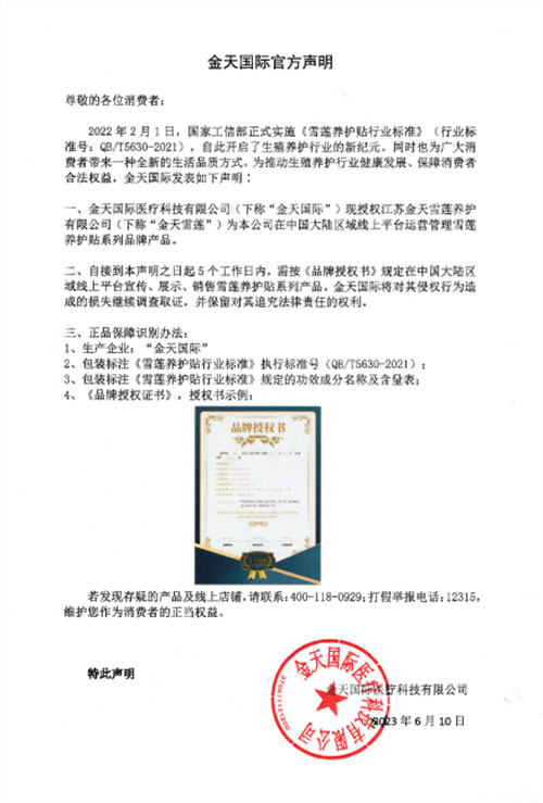 尊敬的各位消费者: 【直报网北京6月13日讯】(金天国际)一直以来,金天国际秉承“普及雪莲养护产业,让更多生命充满活力”的使命,31年来不忘初心,深耕雪莲生殖养护产业,为关心和支持金天国际产品的广大消费者奉献了一系列经典产品。 自2022年2月1日,国家工信部正式颁布了《雪莲养护贴行业标准》(行业标准号:QB/T5630-2021),自此开启了生殖养护行业新纪元。同时也为广大消费者带来一种全新的生活品质方式。为推动生殖养护行业健康发展、保障消费者合法权益、维护企业品牌声誉。 ![]() 金天国际雪莲养护贴 正品护航官方声明 金天国际医疗科技有限公司(下称“金天国际”)现授权江苏金天雪莲养护有限公司(下称“金天雪莲”)为本公司在中国大陆区域线上平台运营管理雪莲养护贴系列品牌产品。 自接到本声明之日起5个工作日内,需按《品牌授权书》在中国大陆区域线上平台宣传、展示、销售雪莲养护贴系列产品。金天国际将对其侵权行为造成的损失继续调查取证,并保留对其追究法律责任的权利。 ![]() 正品保障识别办法: 1、生产企业:金天国际 2、包装标注《雪莲养护贴行业标准》执行标准号(QB/T5630-2021); 3、包装标注《雪莲养护贴行业标准》规定的功效成分名称及含量表; 4、《品牌授权书》,授权书示例: ![]() 若发现存疑的产品及线上店铺,请联系:400-11810929;