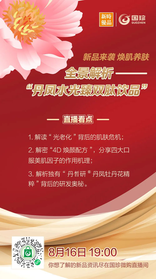 ![]() 【直报网北京8月16日讯】(新时代)万千期待的 丹凤水光臻双肽饮品 即将上市 这款产品的作用机理是什么? 有什么优势? 有什么实验数据支撑? 8月16日 19:00 新品来袭 焕肌养肤 全景解析——丹凤水光臻双肽饮品 特邀国珍健康研究院产品经理 王慧卿 江南大学博士、国珍健康研究院副院长 李爱民 带你看新品背后的研发故事 直播间还准备了 价值690元的丹凤水光臻双肽饮品试饮装 在看播过程中随机抽取 ![]() 扫描下方海报二维码或点击此处