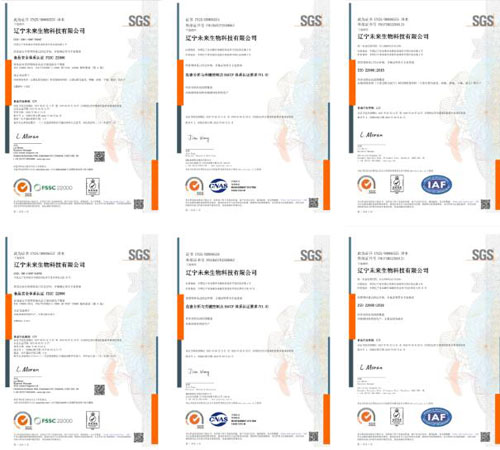 金秋九月,捷报传来!辽宁未来生物科技有限公司在原有ISO 9001、ISO 22000、HACCP 体系认证基础上,历经全球权威认证机构SGS的严苛审核,获得FSSC 22000 体系认证,为产品拓宽国际市场奠定