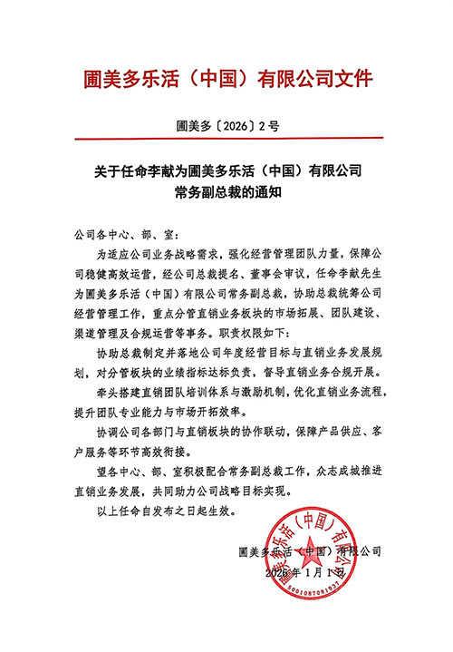 【直报网北京1月4日讯】(圃美多)2026年1月1日,圃美多乐活(中国)有限公司(以下称圃美多乐活)正式发布编号为圃美多〔2026〕2号的人事任命通知。经公司总裁提名、董事会审议通过,李献先生荣膺公司常务副总裁,将协助总裁陶剑俊先生统筹公司整体经营管理工作,重点聚焦直销业务板块的战略落地与效能升级,为品牌深耕中国市场、强化核心业务竞争力注入全新动能。 李献先生具备20年传统外资企业管理经验,在联合利华、飞利浦、戴尔等世界级百强企业担任高管职位,具备丰富的企业运营、市场开发和渠道管理经验,拥有十年以上内外资直销企业高管经历,洞悉市场的发展规律和趋势,同时具备自主创企业连锁品牌和工厂搭建经验。 此次任命是圃美多乐活响应业务战略发展需求、夯实经营管理团队力量的关键举措。其任职将有效完善公司管理架构,强化各环节协同效能,为公司稳健高效运营提供坚实保障。