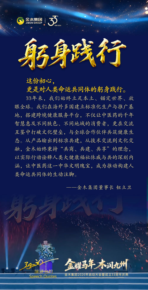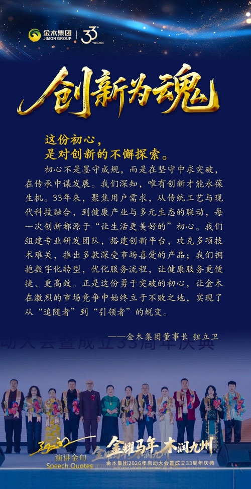 春醒˙沃土《企业初心》 【直报网北京1月27日讯】(金木)春潮涌动,沃土新生。在这万物复苏、生机盎然的美好时节,金木家人欢聚一堂,共同庆祝金木集团33周岁的生日。今天,金木集团董事长和所有金木家人重温那份《企业初心》。 春醒˙沃土《企业初心》 33年前的朴素愿望 “立足沃土、服务民生” 这份初心 是融入血脉的信仰 是一时兴起的承诺 而是历经岁月考验的坚守。 春醒˙沃土《企业初心》 品质为根 这份初心,是对品质的极致追求 春醒˙沃土《企业初心》 创新为魂 这份初心,是对创新的不懈探索 春醒˙沃土《企业初心》 责任为肩 这份初心,是对责任的永恒担当 春醒˙沃土《企业初心》 躬身践行 这份初心,更是对人类命运共同体的躬身践行 春醒˙沃土《企业初心》 同心同行 这份初心,更是全体金木人的同心同行 共筑健康 33年 是一个里程碑 更是一个新起点 未来,我们将继续坚守初心、砥砺前行 我们将让金木的产品和服务惠及更多人 我们将继续践行社会责任 让初心在新时代绽放更耀眼的光芒 新程启航 33年栉风沐雨,初心如磐 新征程砥砺奋进,未来可期 让我们以33周年为新的起点 怀揣着这份扎根沃土的初心