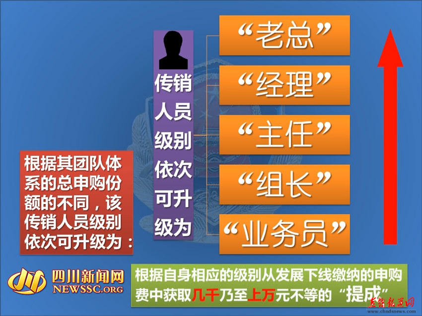 【直报网5月14日讯】(四川新闻网□雷兹)从成都市公安局获悉,近期,成都警方展开了一场西南地区规模最大的打击传销专项清剿行动,抓获传销组织骨干成员21人,挡获参与传销人员504人,打掉一个涉案金额逾1000万元的特大传销犯罪网络,取得了全省今年打击整治传销集中行动的重大胜利。 群众举报小区内传销窝点 警方挡获涉案人员504人 今年春节期间,成都警方接到市民匿名举报称,在位于新都区的一小区内,有人在进行传销活动。接报后,警方立即开展行动,通过顺藤摸瓜,迅速掌握了一个以新都区为核心,辐射成都市锦江、青羊、金牛、成华、武侯、高新、天府新区等15个区(市、县)的庞大传销犯罪网络。警方随即成了“2.26”专案组,全力侦办该案。 为尽快打掉这一庞大传销犯罪网络,根据前期侦查情况,3月26日傍晚,成都警方组织100余名警力对该传销组织骨干成员进行收网抓捕,先后在湖南省长沙市抓获该传销组织的“幕后老总”喻某某,在青羊、金牛、锦江、成华等地抓获该传销组织的成都地区负责人宋某某及管理层骨干共21人。 3月27日7时许,专案组又组织成都各区(市)县公安局经侦民警会同新都区工商、城管、消防、卫生、民兵等力量,对新都区涉及传销的28个小区、177个点位的127户开展集中收网行动,现场抓获参与传销人员504人,成功摧毁了该传销犯罪网络。 借国家名义玩“分钱游戏” 涉案金额超千万元 警方在侦办此案的过程中发现,与以往销售商品的传统传销相比,新型传销系资本运作更具欺骗性和诱惑性,其实质就是该传销组织“幕后老总”喻某某形容的“瓜分金钱的游戏”。 据了解,该传销团伙以连锁销售、资本孵化、民间合伙私募、互助式小额理财为幌子,凭借“国家秘密政策”投资西部大开发的谎言,通过拉人头、吸纳会员、发展下线等方式从事传销活动,大肆牟取非法利益。尤其是所谓的“1040阳光工程”,传销组织宣称投入69800元就可获得1040万元巨款收益,极具蛊惑性。 该组织是如何运作的?警方初步审查后得知,参与者只需缴纳3800-69800元申购费后即成为“业务员”并不断发展下线,以此类推,组成“金字塔”型的传销团队体系。根据其团队体系的总申购份额的不同,该传销人员级别依次可升级为“组长”、“主任”、“经理”、“老总”等,并根据自身相应的级别,从发展下线缴纳的申购费中获取几千乃至上万元不等的“提成”。截至案发时,该传销犯罪团伙已发展传销人员上千人,涉案金额超过1000万元。 |