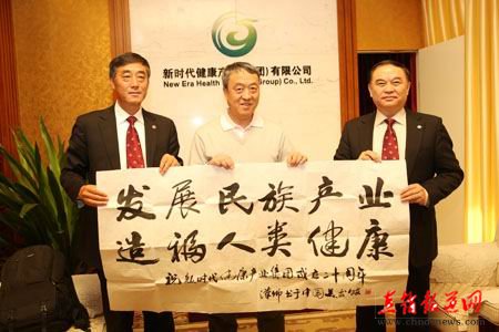 公司领导与来访嘉宾进行亲切交谈 座谈会上,庄正华副会长向公司赠送了“发展民族产业 造福人类健康”的题词,作为对新时代健康产业集团成立二十周年的贺礼。庄正华还代表中国企业文化促进会,表达了对公司发展的良好祝愿与热切期望。
