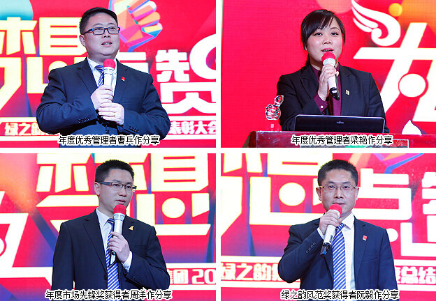 在全场热烈的掌声和大家目光的聚焦下,绿之韵集团董事长胡国安先生做了重要压轴的讲话,向所有获奖者予以了高度评价并衷心感谢,感谢绿之韵所有员工的辛勤付出,及所有关心绿之韵事业的各位朋友,是你们才有绿之韵事业持续健康的发展。董事长胡国安非常深情地向莅临现场的母亲表示感谢,是母亲生他、抚养他、教育他,他才有今天事业的成就。 董事长胡国安告诫大家,绿之韵是一个与家人分享的平台,是一个出新成就的舞台,不管是各位员工,还是经销商都可以成为自己家人的骄傲,学习的榜样。同时,向公司全体上下致以诚挚的新春问候,对2014年各部门坚持不懈、求真务实、兢兢业业的工作,积极化解各种挑战,在各种工作困境中突围,企业始终保持着良性发展势头,取得了一系列新成绩、新突破予以肯定与赞扬!为大家点赞,为年轻的团队点赞,为天城网点赞,为商学院点赞,为第一次投资房地产点赞,为曾经受到批评的员工点赞,为所有在绿之韵事业里奋斗过的朋友点赞……最后,胡国安董事长还表示,希望全体绿之韵人2015年团结协作,再接再厉,谱写辉煌新章! |