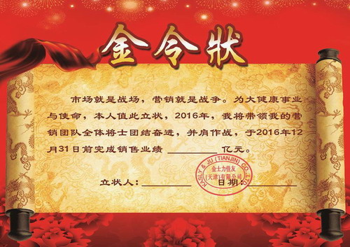 酒通自然,酒通政和,酒通友情,酒通身心。古人用酒,祈天地之福、祭宗庙之尊、迎宾客之礼、立出征之志。一段圆舞曲,一章国台赋。昔有红军长征,三渡赤水,驻跸茅台,古镇休整。今有天士力人钢铁意志、雷厉风行、酒洗征尘,如洽春风。主席有感而发,同石广羽老师一同高歌一曲《咱当兵的人》。 “当兵的人”是现代军人的代名词,也是一个透着光荣感、充满自豪感的称谓。在改革开放的年代里,军人们放弃了不少个人机遇,以无私奉献精神,履行保卫祖国的神圣职责。1994年,当兵出身的作者在部队深入生活时有感于此,创作了歌曲《咱当兵的人》。正是这种当兵的人的精神,在同一时期,鼓舞着天士力的创业者们“青春年华,热血儿郎,渴望辉煌,赢得荣光”。 而如今,“十三五”时期要实现目标,就要有“当兵的人”的精神,坚忍不拔、英勇顽强的坚强意志和毅力,坚持一个蓝图绘到底,一个方向奋斗到底。今日,是金士力佳友营销将士2016年出征之日,每一位金士力人在军人精神的感染下,晚宴亦是出征壮行宴。金士力佳友公司总经理为金士力发展决策委员会各位成员颁发金令状。 在雄壮的音乐声中,立状者庄重上台接令,他们是市场拓展的将士,是金士力佳友的脊梁;他们忠诚企业,荣辱与共,承载着推广大健康理念的责任;他们服务社区、走进家庭,诚信为本,求真务实,带领团队百折不挠、百岁不垮。 发展决策委员会全体成员领过金令状,沙场秋点兵,共饮立状酒,誓师“十三五”。在全体嘉宾共同见证中,晚宴接近尾声,全体营销将士们用立状誓师之火锤炼理想和信念,将军人精神发扬光大,金戈铁马,精诚团结,2016目标必定实现。▲ (原标题:目标不打折扣 闫希军鼓励金士力佳友出成绩) 责任编辑:尘风 解读新闻热点、呈现敏感事件、更多独家分析,尽在“直事儿”微信,扫描二维码免费阅读。