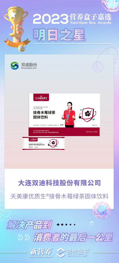 【直报网北京6月12日讯】(双迪)6月7日,“2023第11届新营养大会暨「营养盒子」颁奖盛典”隆重举行,双迪旗下产品:天美康优质生®接骨木莓绿茶固体饮料喜获新营养“明日之星”奖项。 这也是继桃花养元汤™植物固体饮料获得“第十届·2022新营养大会暨「营养盒子」颁奖盛典”「营养盒子Nutrition Box」国风食养类爆品奖后,第二次在该盛会上斩获殊荣。 ![]() ![]() 本届大会力邀数十位行业大咖,共话营养未来。深度聚焦营养健康行业,希望通过「新营养大会」,打通行业上下游,融合更多创新思想,在营养浪潮中翻涌一朵浪花、窥见一方天地。