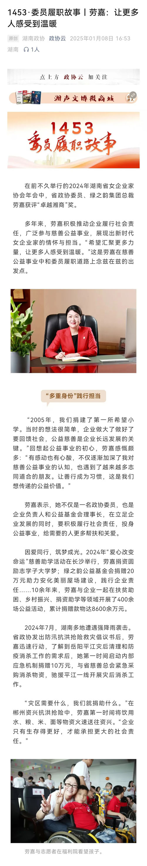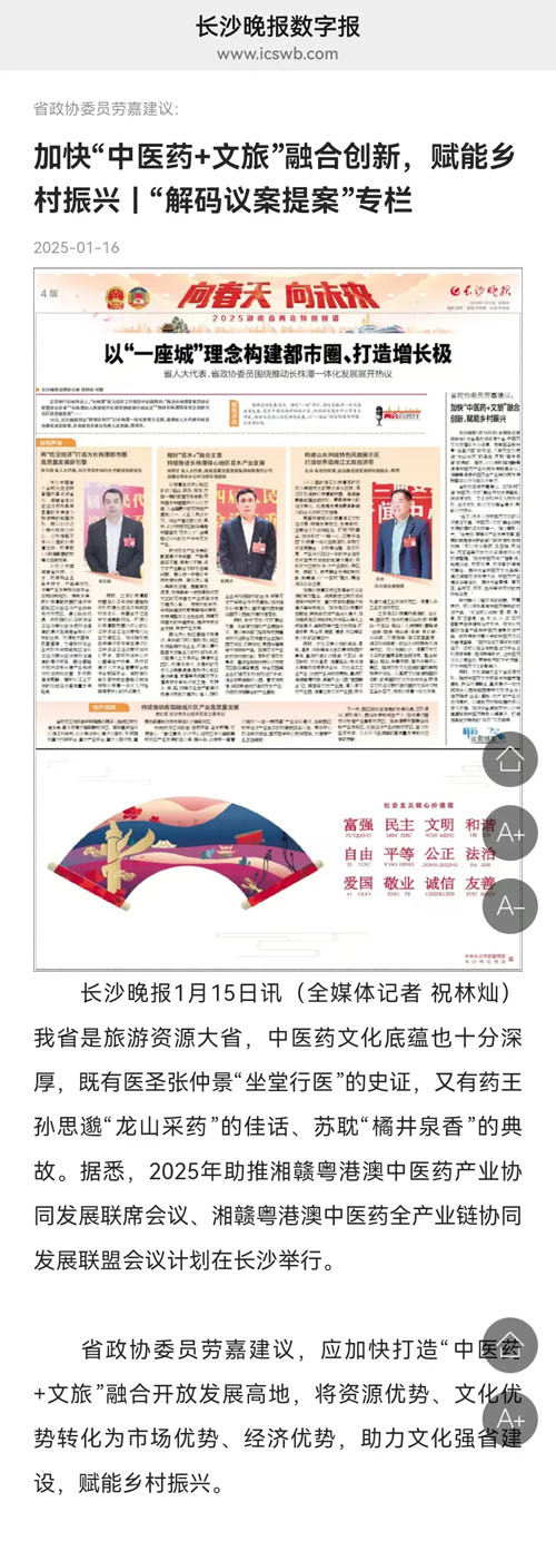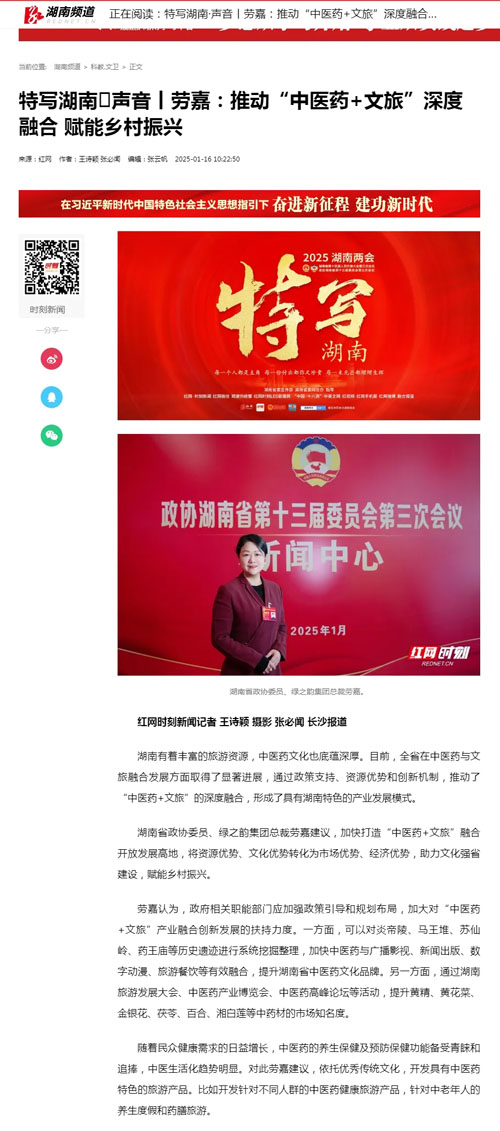 持续提升“1453” 全力服务“三高四新” 湖南省政协十三届三次会议召开 省委书记沈晓明、省长毛伟明等领导出席 省政协主席毛万春作政协常委会工作报告 劳嘉委员提案引媒体聚焦报道 ![]() 湖南省第十四届人民代表大会第三次会议 ![]() 中国人民政治协商会议湖南省第十三届委员会第三次会议 【直报网北京1月20日讯】(绿之韵)2025年1月13日,中国人民政治协商会议湖南省第十三届委员会第三次会议在省人民会堂开幕。来自全省各族各界、各条战线的省政协委员齐聚长沙,积极履行政治协商、民主监督、参政议政职能,为加快实现“三高四新”美好蓝图、奋力谱写中国式现代化湖南篇章尽政协之责、展政协之长、倾政协之力。 出席开幕会并在主席台就座的有:中共湖南省委书记、省人大常委会主任沈晓明,省委副书记、省长毛伟明,省政协主席毛万春,省政协副主席赖明勇、张健、张灼华、胡伟林、李民、肖百灵、潘碧灵、何寄华,省政协秘书长邓群策。全国人大农业与农村委员会主任委员杜家毫在主席台就座。湖南省政协委员、绿之韵集团总裁劳嘉出席会议,积极参政议政。 ![]() ![]() ![]() 1月13日上午9时,湖南省政协副主席胡伟林宣布大会开幕,全体起立,奏唱国歌。湖南省政协主席毛万春代表政协湖南省第十三届委员会常务委员会向大会作工作报告。报告全面回顾总结了十三届省政协2024年的主要工作成绩。毛万春指出,一年来,省政协主要做了以下工作:始终坚持党的全面领导,贯彻习近平总书记考察湖南重要讲话和指示精神,落实中共湖南省委十二届六次、七次、八次全会部署,深化“1453”履职实践;着力服务改革发展大局,聚焦大事搞协商,紧盯难事搞监督,紧扣实事搞助推,为改革增动力、聚合力、添助力;落实“守护好一江碧水”政治责任,坚持不懈推进改善生态环境专项民主监督;积极助力文化强省建设,聚焦“三个文化”“两个融合”,提出增强文化软实力的13条对策建议,深入开展传承红色基因、助推文化产业、挖掘文史资源、擦亮文旅名片、引育文化英才、传播湖湘文化等六个方面的行动;广泛开展团结联谊活动,加强与各民主党派省委会合作共事,持续擦亮湘港澳交流合作履职品牌,组织对外交流交往,加强与非公有制经济人士、新的社会阶层人士的沟通交流;扎实做好经常性工作,加强和改进提案工作,发挥社情民意信息直通车作用,持续推进数字政协建设,深化委员工作室提质增效;切实加强“两支队伍”建设,优化“三个方面保障机制”,压实全面从严治党主体责任,扎实开展党纪学习教育。过去一年的实践中,我们深深感到:党的领导是政协的初心,团结是政协的主题,民主是政协的生命,实干是政协的要义,清廉是政协的底色。 “2025年是‘十四五’规划收官之年,也是本届省政协履职全面深化提质之年。”毛万春指出,要坚持以习近平新时代中国特色社会主义思想为指导,深入贯彻习近平总书记在庆祝人民政协成立75周年大会上的重要讲话精神,认真落实中共中央决策部署和中共湖南省委工作要求,坚持党的领导、统一战线、协商民主有机结合,持续深化“1453”履职实践,更好发挥专门协商机构作用,为我省改革发展贡献政协力量。 ![]() 湖南省第十四届人民代表大会第三次会议开幕,中共湖南省委书记沈晓明主持开幕大会 ![]() 湖南省第十四届人民代表大会第三次会议开幕,省长毛伟明作政府工作报告 ![]() 湖南省政协十三届三次会议开幕,省政协主席毛万春向大会作工作报告 ![]() 湖南省政协委员、绿之韵集团总裁劳嘉出席会议 1月14日上午,劳嘉委员以列席身份参与湖南省第十四届人民代表大会第三次会议,与各界代表一同认真听取并深入讨论了《省政府工作报告》。报告凭借详实的数据与务实的规划,清晰呈现出湖南在经济增长、社会建设、科技创新等多个维度取得的卓越成就,同时也勾勒出宏伟的发展目标。劳嘉委员全程专注聆听,认真记录,力求深刻领会报告的精神实质。在分组讨论环节,劳嘉委员积极参与其中,与代表们各抒己见、思想碰撞。大家围绕省委、省政府的中心工作,聚焦湖南改革发展的大局,针对人民群众普遍关心的重点问题展开深入探讨与交流。 在政协履职进程中,劳嘉委员紧扣时代发展脉搏,精准锚定“中医药+文旅”融合领域,精心提报的《关于打造“中医药+文旅”融合开放发展高地、助力乡村振兴的建议》提案极具前瞻性与建设性。劳嘉委员深刻洞察到,湖南作为旅游资源大省与中医药文化厚土,虽在中医药与文旅融合已获初步成果,但仍面临着中医药文化年轻受众认知不足、产业模式支持度低、产品创新乏力等问题。为此,她建议:政府应强化政策引导与规划,深度挖掘炎帝陵、马王堆、苏仙岭、药王庙等遗迹所承载的文化内涵,推动多业态融合发展,通过举办展会等形式提升湖南中药材的知名度;依托湖湘传统文化,创新开发中医药保健品以及分众化的旅游产品,满足不同群体的需求;大力推进农业产业化进程,将文旅产业与种植养殖、民俗文化相结合,建设集多种功能于一体的产业综合体与特色小镇;充分借助新媒体平台以及微电影等新兴传播形式,广泛传播中医药文化,提升社会各界对该产业的认知度与参与度,进而为乡村振兴提供有力推动。潇湘晨报、湘声报、红网、长沙晚报等主流媒体迅速聚焦劳嘉委员及