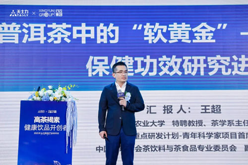 在"立信"篇章,天士力降茶通过多重科学验证夯实产品公信力。湖南农业大学茶学系主任王超博士首先从成分本源出发,权威阐述了普洱茶中的关键功能因子——茶褐素的科学研究进展。他将茶褐素誉为“普洱茶中的软黄金”,系统介绍了其在调节糖脂代谢等方面的独特价值,为天士力降茶的功效奠定了坚实的成分理论基础。