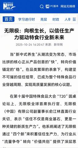 编者按 【直报网北京9月26日讯】(无限极)近日,在第十届中国特殊食品大会“T20” 圆桌论坛上,无限极全球首席执行官、无限极(中国)有限公司副董事长俞江林直面行业关切,系统阐述了无限极通过“四个新”来积蓄信任生产力,为行业从“流量争夺” 转向“价值共创”提供了深层思考。以下为新华网报道原文: ![]() 当“新中式养生”从潮流变为常态,市场比拼的核心正从产品创意的“快”,转向价值锚定的“稳”。在品类繁荣的表象下,构建坚不可摧的信任纽带,已成为整个特殊食品行业穿越周期、实现高质量发展的核心议题。 在第十届中国特殊食品大会“T20”圆桌论坛上,无限极全球首席执行官、无限极(中国)有限公司副董事长俞江林直面行业关切,表示“信任不仅是商业基石,更是一种关键的新质生产力”。他系统阐述了无限极通过 “四个新”来积蓄信任生产力,为行业从“流量争夺” 转向“价值共创”提供了深层思考。 ![]() 无限极全球首席执行官 无限极(中国)有限公司副董事长 俞江林在T20圆桌论坛上发言 俞江林指出,无限极在第六个五年计划中,将“向根生长,积蓄信任生产力”置于战略核心。具体而言,公司正通过四个“新”展开: “定义新观念”—— 倡导“新平衡主义”,培养人们的健康认知和生活方式,打造中华养生领导品牌; “实践新调养”—— 融合东方智慧和现代方法,提供中华养生解决方案,调养根本; “再造新附近”—— 通过中华养生客厅与中华养生社群,建立在身边、更温暖、可持续的连接; “赋能新伙伴”—— 打造中华养生顾问队伍,赋予创业合伙人新的身份、新的价值。 特别值得一提的是,无限极通过养固健品牌倡导的“新平衡主义”,正是对当前用户健康需求的直接回应。养固健在用户调研中发现,压力导致身体亚健康、内心焦虑孤独等状况,身体与生活双重失衡。为此,养固健不仅提供中草药科技产品来助力身体平衡,更倡导“四合理”生活方式来帮助用户重建生活平衡,旨在弘扬养生文化。 谈及信任构建的细节坚守,俞江林先生介绍了今年上升为企业价值观之一的“100-1=0”的质量理念。在源头端,无限极在全国23地建立了70多个道地中草药种植基地,通过严格的“七统一”管理体系与“养固健天眼追溯管理系统”,实现了从种植到成品的全程可追溯。在制造端,公司南北两大工厂均以“透明工厂”标准面向公众开放,主动接受社会监督。在终端层面,无限极严格规范经销商行为,恪守“不夸大、不硬销、不打扰”的服务底线。同时,通过“八段锦主理人认证”等创新形式,赋能经销商组织社群活动,推动其从“产品销售者”向“专业健康生活陪伴者”的角色转变,于细微处持续深化用户信任。 这些扎实举措印证了一个逻辑:信任的构建源于对每个细节的坚守。当企业放下短期功利心,以利他态度与用户建立深度连接和长久陪伴,品牌信任便会自然生长、日益深厚。