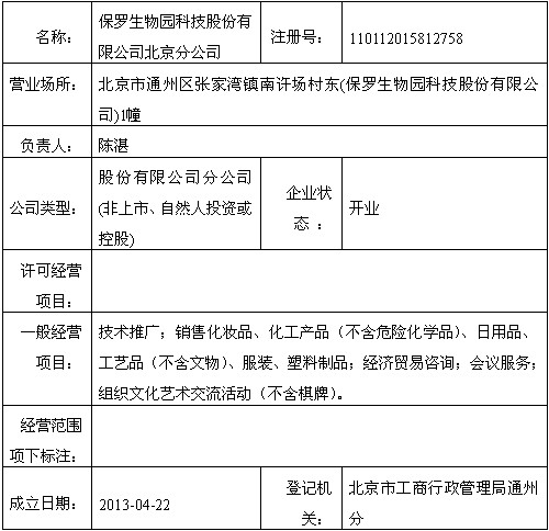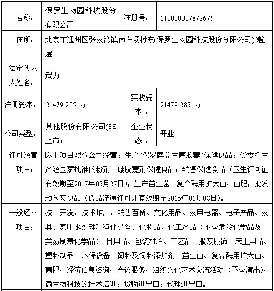 保罗生物园科技股份有限公司 公司简介: 保罗生物园科技股份有限公司下辖两园——保罗生物园、保罗生态园、七个子公司以及微生态制剂高端技术研发、微生态保健、日化产品制造、微生态农业制剂制造等事业板块,是中关村国家院所通州产业园中的一员,位于通州国际新城建设的核心区域。 保罗生物拥有40000㎡产业园区,现代化商务办公区、会议中心、GMP认证的保健品、食品生产基地、10万级洁净度的日化生产基地、酵素菌肥研发中心和院士专家工作站,以及全自动化发酵生产线、医药级冻干生产线、国家级原菌发酵车间等。独有的“百草园”、产品体验中心、会馆、园林景观等设施成为园区独特的风景线。她是国家发改委认定的微生物制造产业化基地,科技部国家级火炬计划项目认定的产业化生产基地,国家863计划项目研发实验基地。 保罗生物旗下保罗生态园位于京杭大运河北段、北京市通州经济开发区。她是与国内外专家联合设计打造的绿色环保、可持续发展、低碳的示范园区,是运河岸边的一片绿色奇葩、通州国际新城的一个天然氧吧;也是 保罗生物农业板块的特色实验基地,是通州新城规划中唯一的以高端制造为发展目标的通州开发区的东北门户。